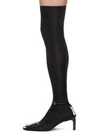 Knee-high semi-sheer stretch nylon jersey sock-style boots in black. · Buffed goatskin straps throughout · Pointed toe · Pin-buckle ankle strap · Covered stiletto heel with rubber injection · Leather sole · Heel: H3" Supplier color: Black Textile, goatskin. Made in Italy 241249F122006