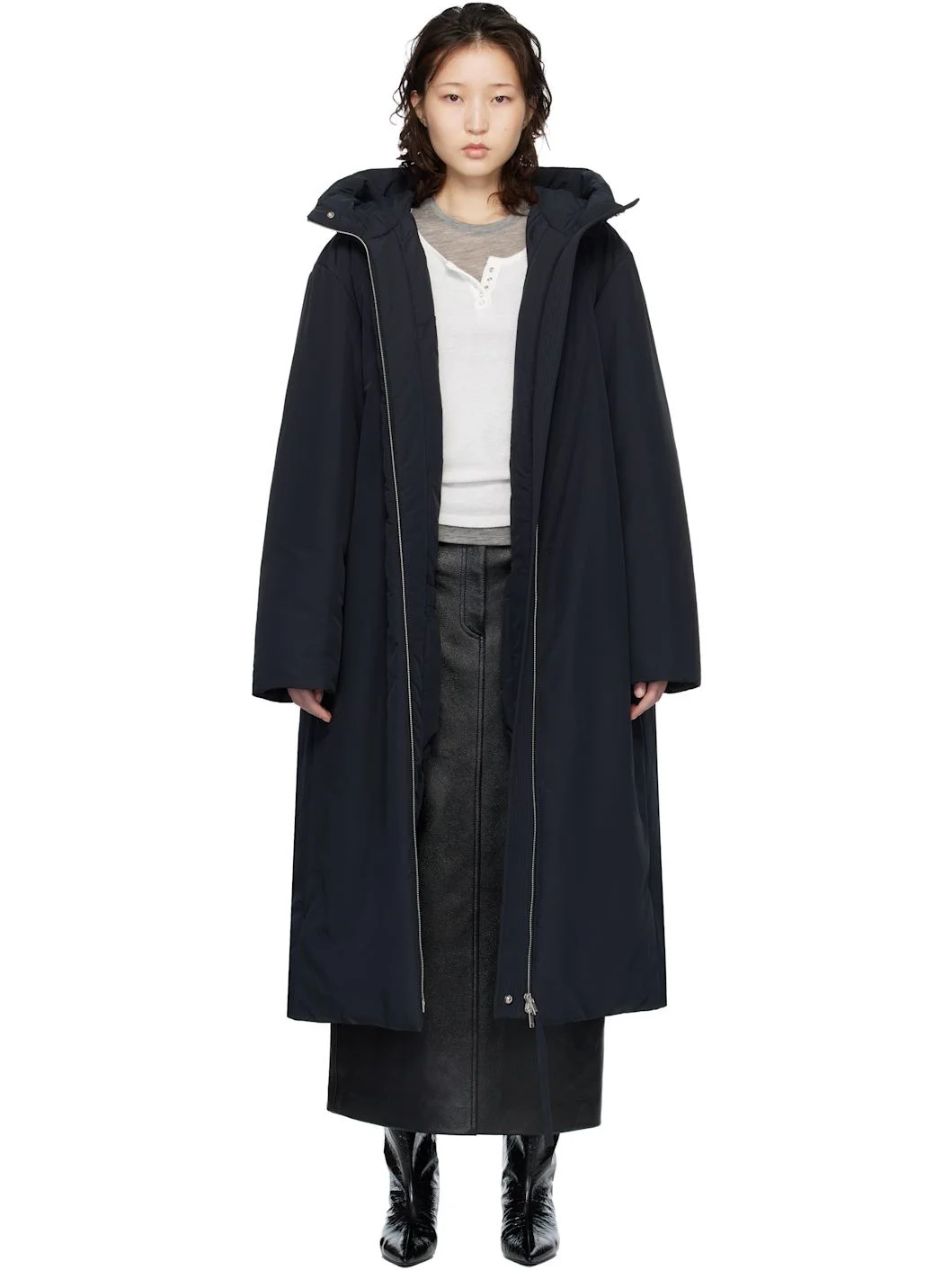 Down-filled taffeta coat. · Hood at funnel neck · Two-way zip closure · Zip seam pockets · Dropped shoulders · Patch pockets at interior · Fully lined Supplier color: Black Body: 100% polyester. Trim: 100% cotton. Fill 1: 100% polyester. Fill 2: 85% goose down, 15% goose feather. Lining: 100% polyester. Made in Italy 252249F061006