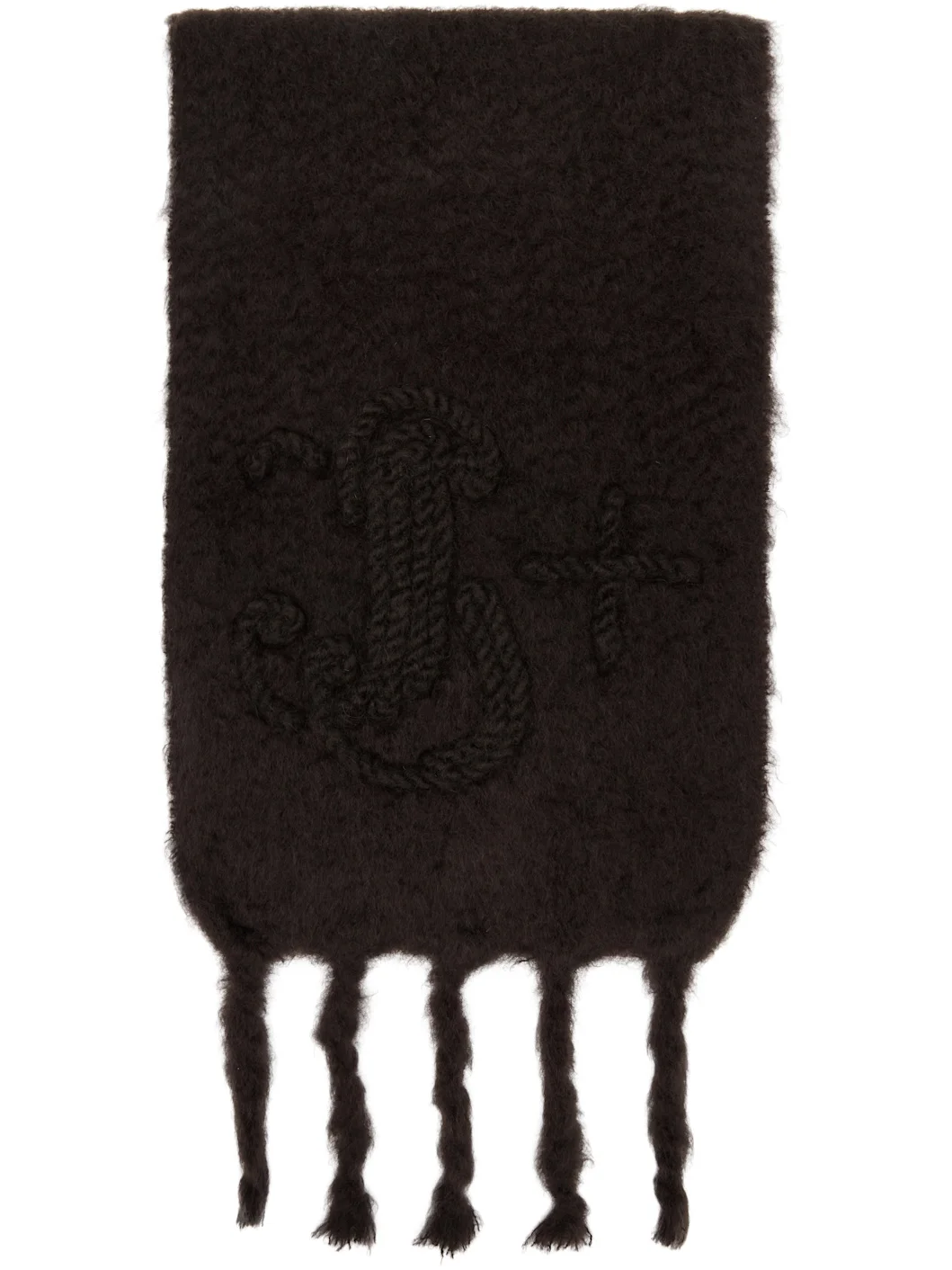 Rectangular hand-knit mohair- and wool-blend scarf. · Braided logo applique at face · Fringed detailing at ends · L86" x W16.5" Supplier color: Burgundy 73% mohair, 24% wool, 3% polyamide. Made in Spain 252249F028003