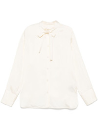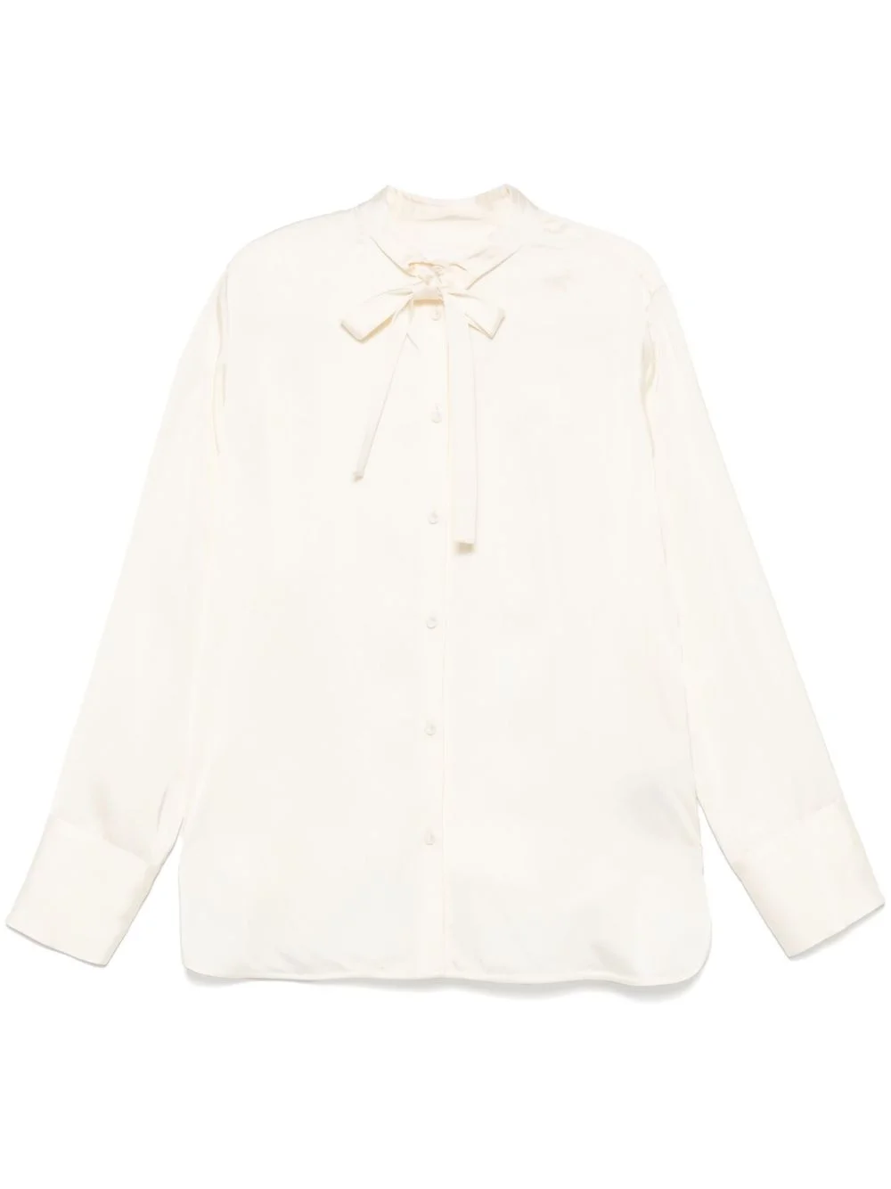 satin shirt Highlights - Light beige - Front button fastening - Gathered tie neck - Buttoned cuffs - Side slits Made in Italy Composition Viscose 100% SIZE & FIT Model measurements Height 5 ft 9 in(1.76 m) Bust/Chest 32.28 in(82 cm) Hips 35.43 in(90 cm) Waist 25.19 in(64 cm) FittingInformation Designed to be unstructured, offering a loose fit throughout Made from a midweight non-stretch fabric