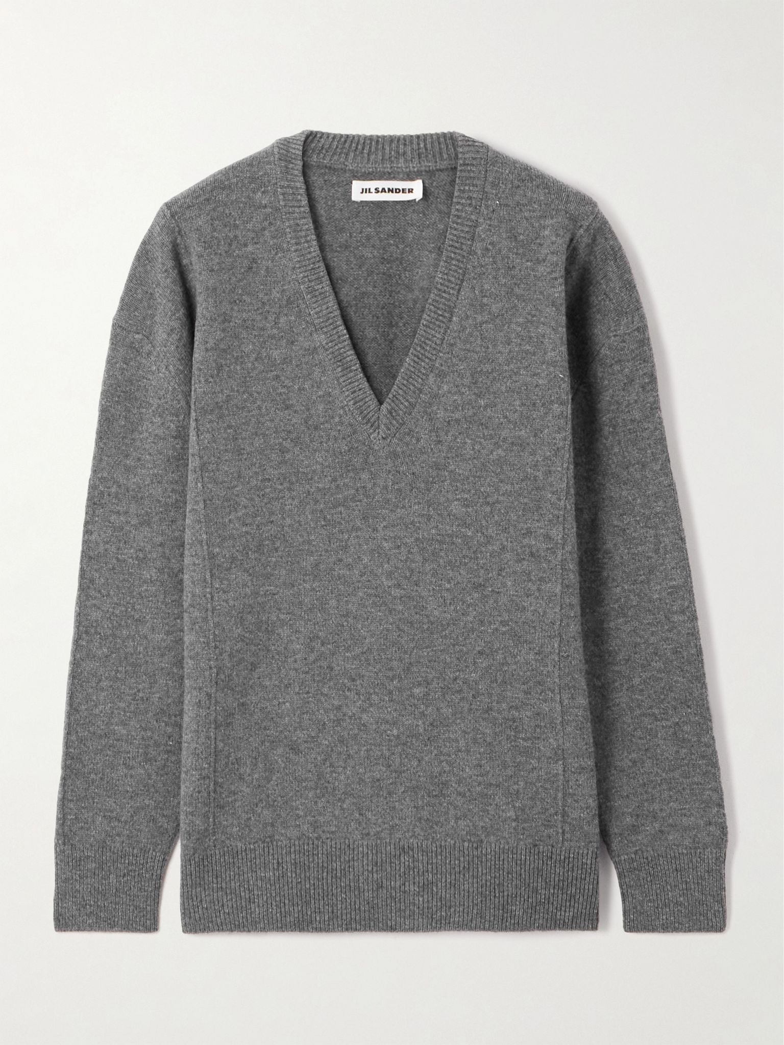 Jil Sander's V-neck sweater is a classic style you'll turn to for years. It's knitted from a blend of wool and cashmere that's soft and insulating and has seamed detailing throughout. Size & Fit - Fits true to size, take your normal size - Designed for a relaxed fit - Mid-weight knit - Model is 177cm/ 5'10" and is wearing a DK 34 Model measurements: - Bust: 85cm/ 33.5" - Waist: 62cm/ 24.5" - Hip: 91cm/ 36" Details & Care - Gray wool and cashmere-blend - Slips on - 70% wool, 30% cashmere - Dry clean
