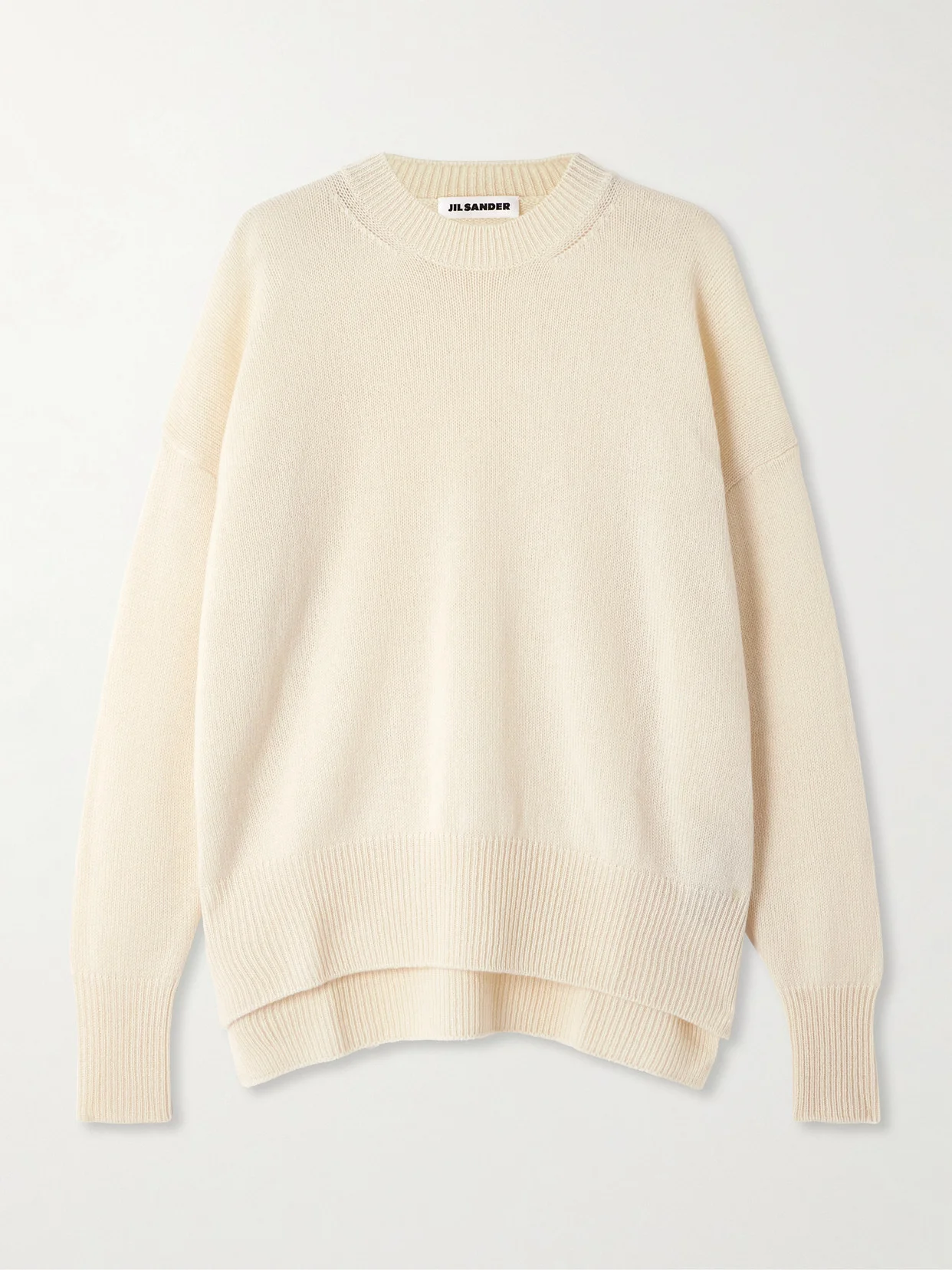 There are a few key design details that make this Jil Sander's sweater so special. It's knitted from soft, fine wool and has super dropped shoulders and slits at the side, so it hangs beautifully on the frame. Note, too, the elongated ribbing at the hem, which encourages that gorgeous drape.