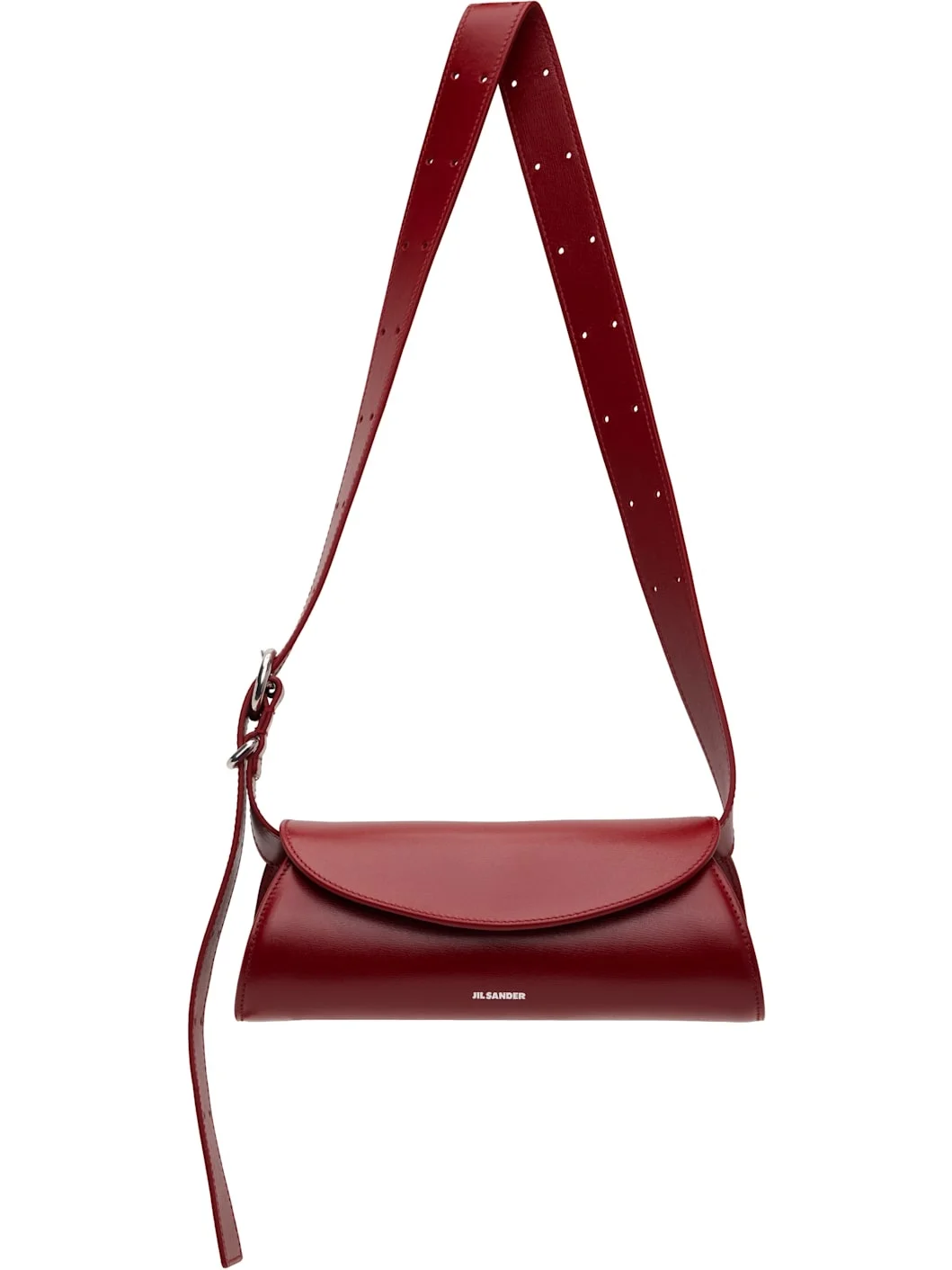 Buffed calfskin shoulder bag in red. · Adjustable shoulder strap · Logo stamp at face · Magnetic press-stud flap · Grained lambskin lining · H3.5" x W8.5" x D3.5" Supplier color: Cedar red Calfskin. Made in Italy 251249F048013