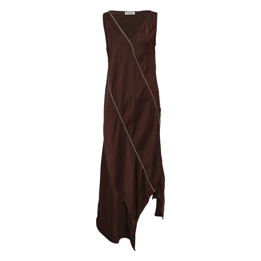 600077922BUR034 / J01CT0268/J65022/602 - Diagonal chain detailing across front - Asymmetrical draped silhouette - Sleeveless V-neck design - Sustainable material construction - Unlined for fluid movement - Midi length with irregular hemline - Relaxed fit through body The Jil Sander Chain Detail Sustainable Dress delivers minimalist luxury with eco-conscious craftsmanship and architectural draping. Crafted from sustainable materials in rich chocolate brown, featuring an asymmetrical silhouette with diagonal chain detailing and dramatic side draping. The sleeveless design and fluid construction create an effortlessly sophisticated statement piece for modern wardrobes.