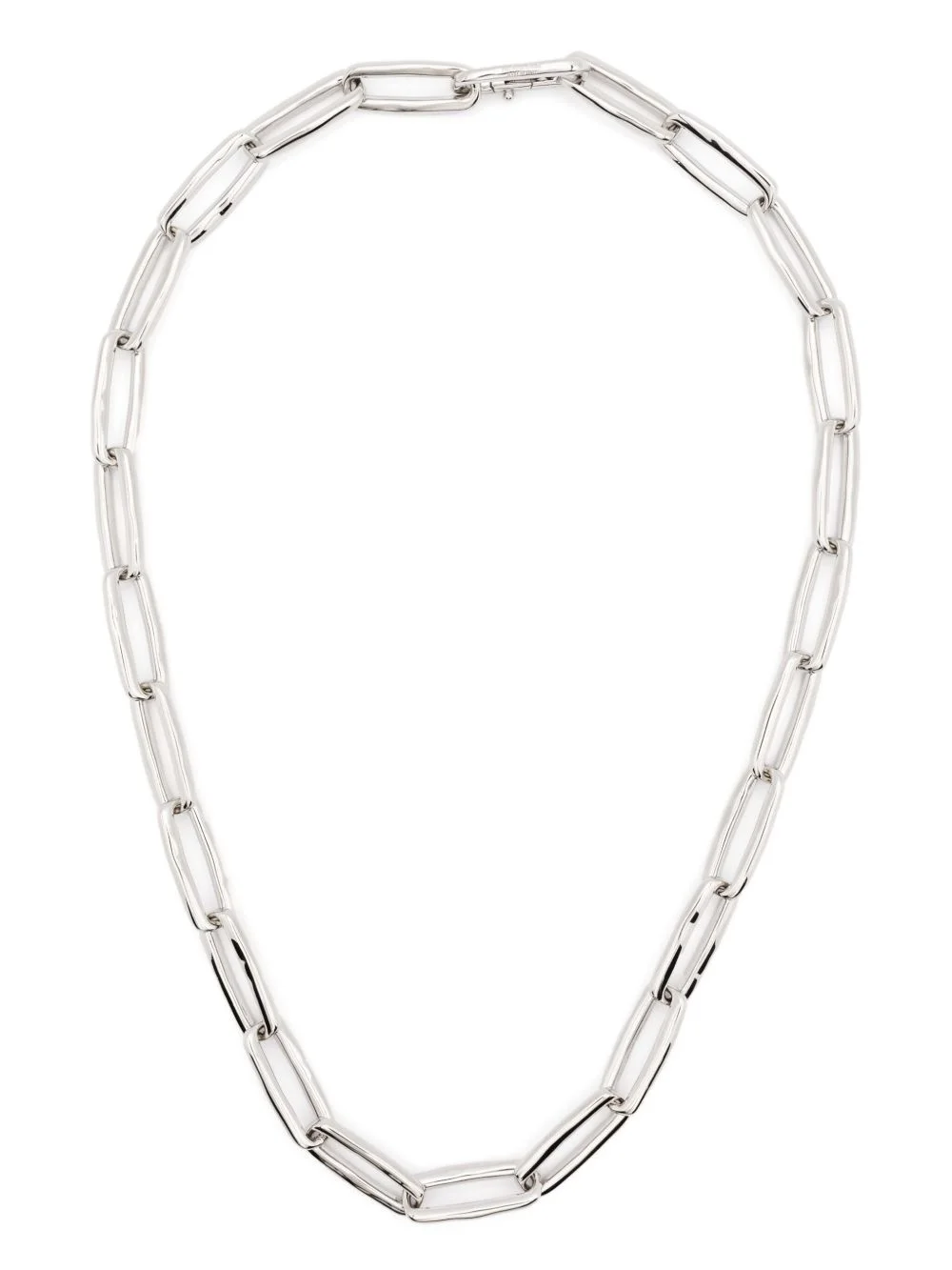 chain-link necklace silver-tone clasp fastening polished finish Imported SIZE & FIT Model measurements Height 5 ft 9 in(1.75 m) Bust/Chest 31.88 in(81 cm) Hips 34.64 in(88 cm) Waist 24.01 in(61 cm) Measurement Length when open 20.86 in(53 cm) WIDTH 0.39 in(1 cm)