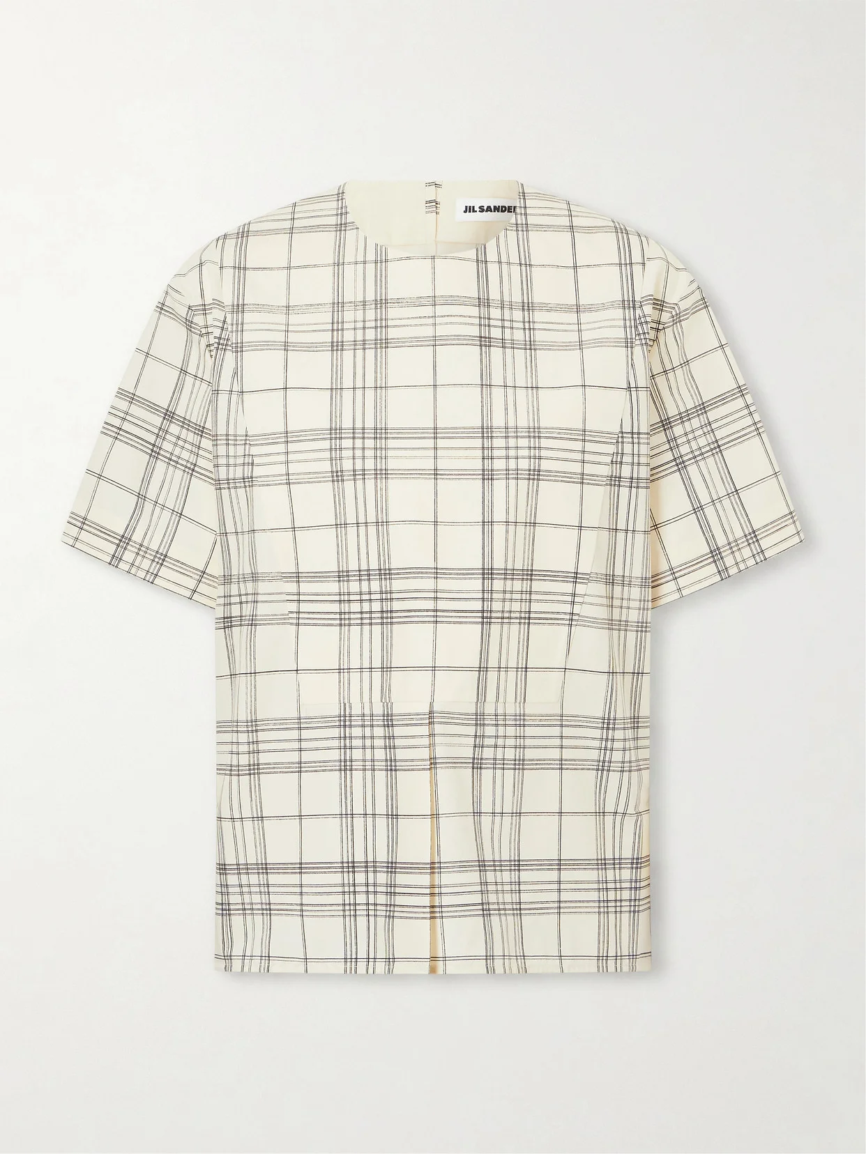Jil Sander's T-shirt draws on graphic design, patterned with monochrome checks that resemble pen sketches. Cut from cotton, it features a bib-like front panel and an inverted pleat that accentuates the boxy silhouette. Echo the linear motif with a swipe of eyeliner.