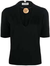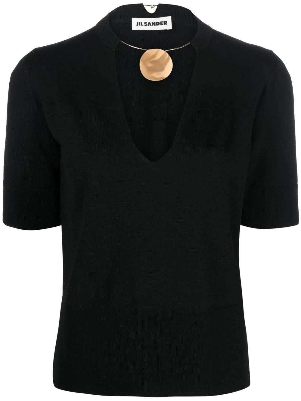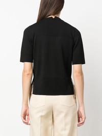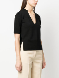 choker-neck short-sleeve top black virgin wool gold-tone hardware plunging V-neck round neck short sleeves short side slits Made in Italy Composition Virgin Wool 100% SIZE & FIT Model measurements Height 5 ft 11 in(1.8 m) Bust/Chest 31.49 in(80 cm) Hips 36.22 in(92 cm) Waist 25.59 in(65 cm) FittingInformation This piece fits true to size. We recommend you get your regular size Cut for a relaxed fit Made with a mid-weight fabric Washing instructions Dry Clean Only