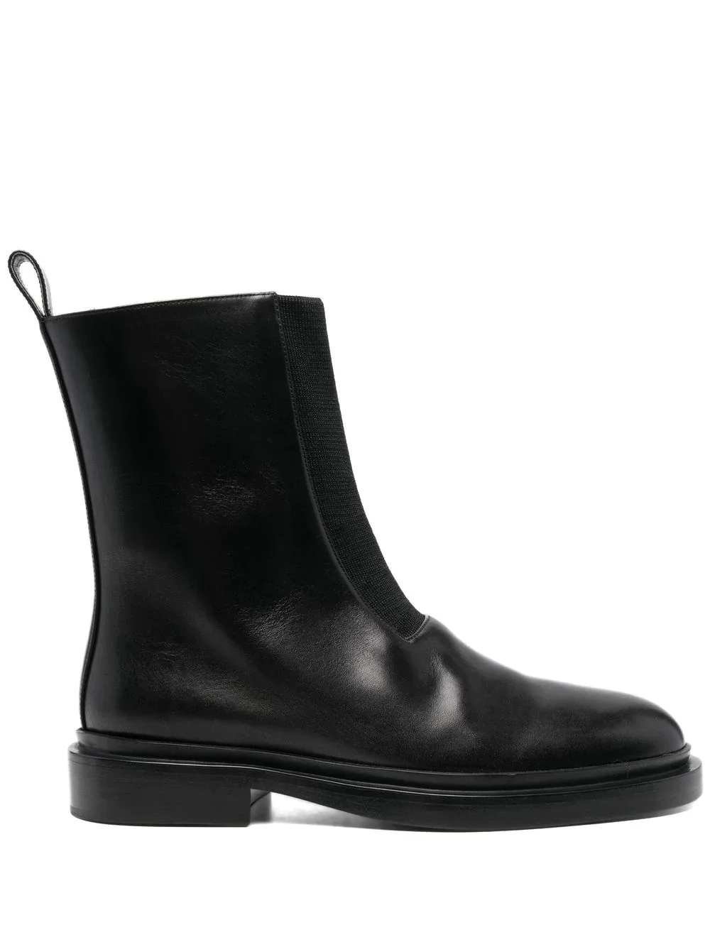 chunky leather boots black leather round toe pull-tab at the heel elasticated panelling flat leather sole Made in Italy Composition Outer: Leather 100% Lining: Leather 100% Sole: Leather 100% SIZE & FIT Measurement HEEL 1.37 in(3.5 cm) HEIGHT 6.69 in(17 cm) Sole height 0.78 in(2 cm)