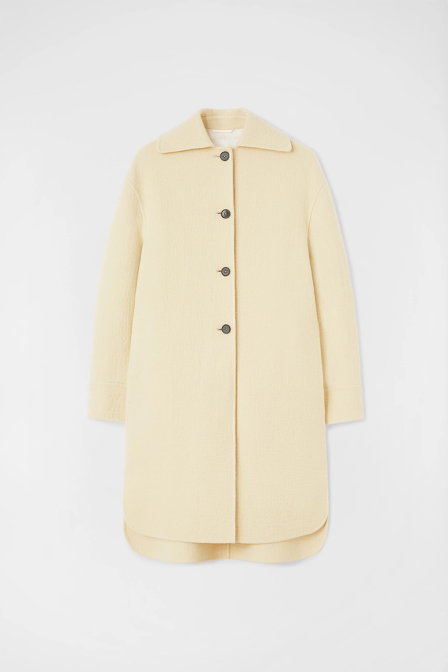 Felted virgin wool coat with wide spread collar detail Details - oversized fit and single-breasted - unlined - visible front button closure - dropped shoulders and spread collar - two-buttoned cuffs - shorter front and curved hems - 100% virgin wool - made in Italy - StyleID: J04AA0002J40020261 Care - dry clean only - iron with care Fit - model is 177cm/5'9" and is wearing a size 34 DE - Please note that the physical label of the item will show the German size
