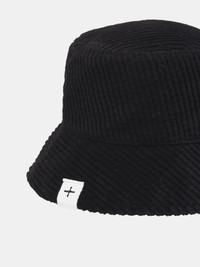 JIL SANDER hat in black, bucket hat design, paneled cotton construction, corduroy texturing, logo patch, scalloped hem, floppy brim. 100% Cotton Standard Sizing
