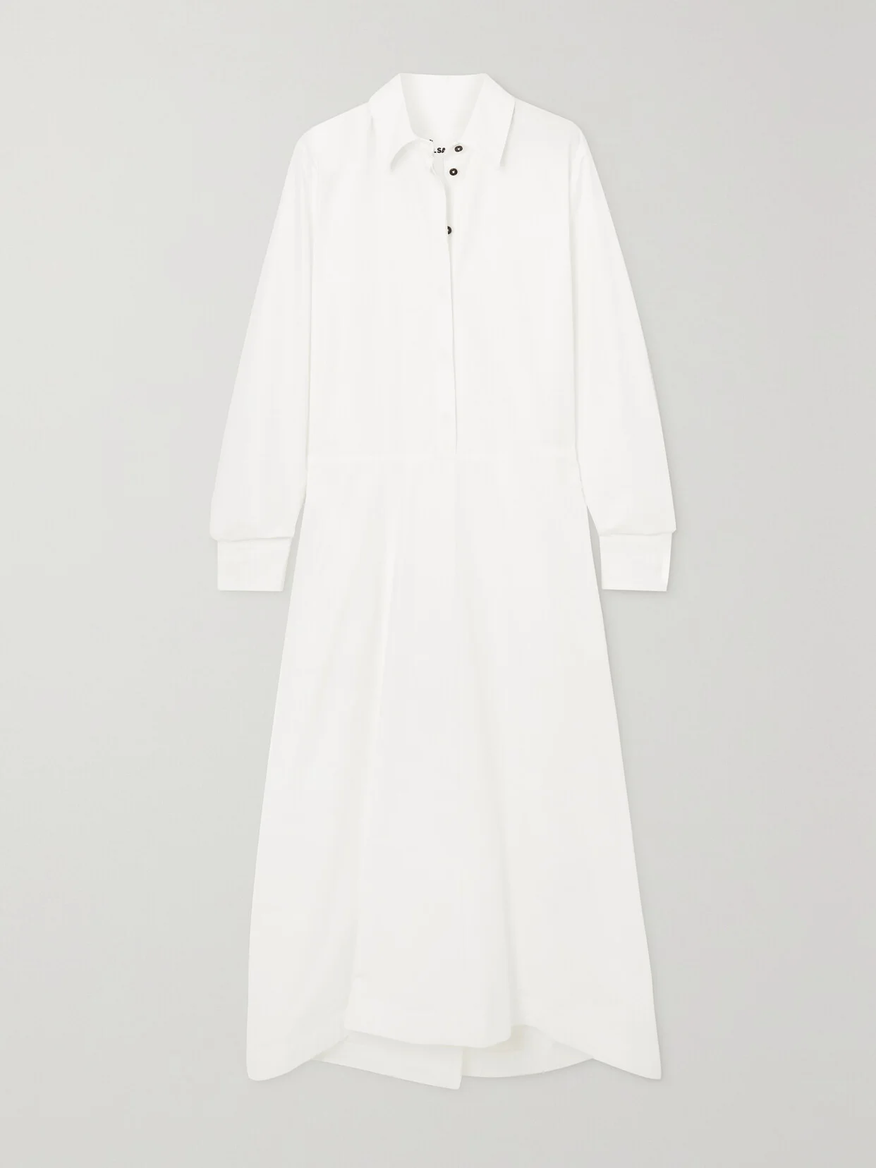 Jil Sander showcases the power of clean lines with this shirt dress. It's cut from crisp cotton-poplin with a loose-fitting bodice and voluminous, bell-shaped skirt. Wear yours with sculptural silver-tone jewelry and flats.