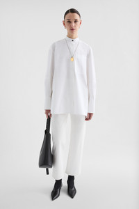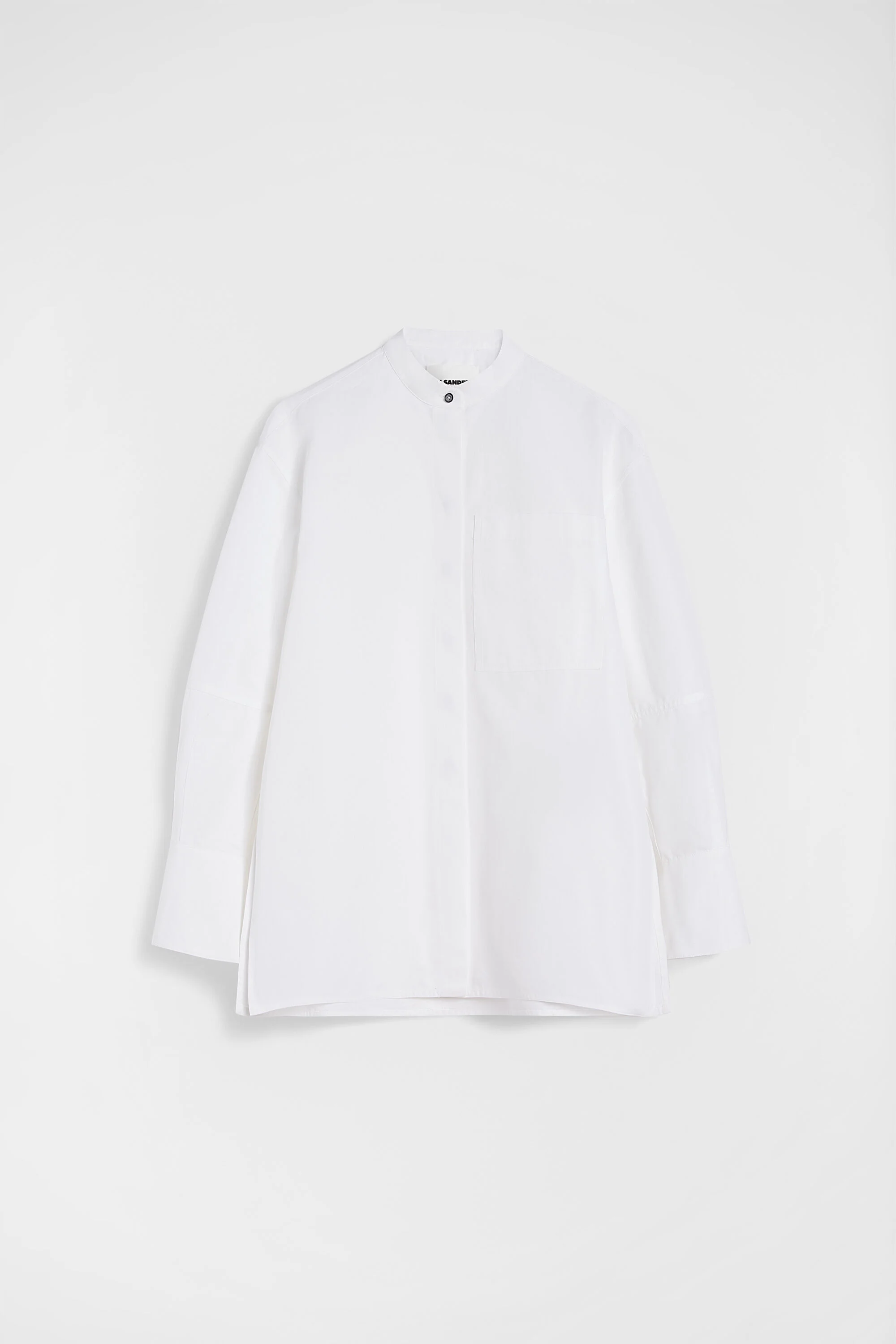 Long-sleeved cotton shirt Details - oversized and straight cut - we recommend taking one size down - dropped shoulder - hidden button closure - one-button stand collar - one-pleat sleeves and one-button cuffs - front patch pocket - rounded hem - organic cotton poplin - primary fabric: 100% cotton - made in Italy - StyleID: J04DL0007J45002100 Care - dry clean only - iron with care Fit - model is 177cm/5'9" and is wearing a size 34 DE - Please note that the physical label of the item will show the German size