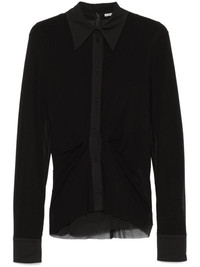 crepe shirt Highlights - Black - Crepe texture - Front button fastening - Straight-point collar - Long sleeves - Buttoned cuffs - Gathered detailing - Ruched detailing - Full lining - High-low hem Made in Italy Composition Viscose 100% SIZE & FIT Model measurements Height 5 ft 9 in(1.75 m) Bust/Chest 34.64 in(88 cm) Hips 36.61 in(93 cm) Waist 26.37 in(67 cm) FittingInformation Designed for a slim fit that sits just away from the body offering a close yet comfortable fit The detachable slip sits just away from the body, offering a close yet comfortable fit Made from a midweight non-stretch fabric, this piece offers minimal elasticity when worn