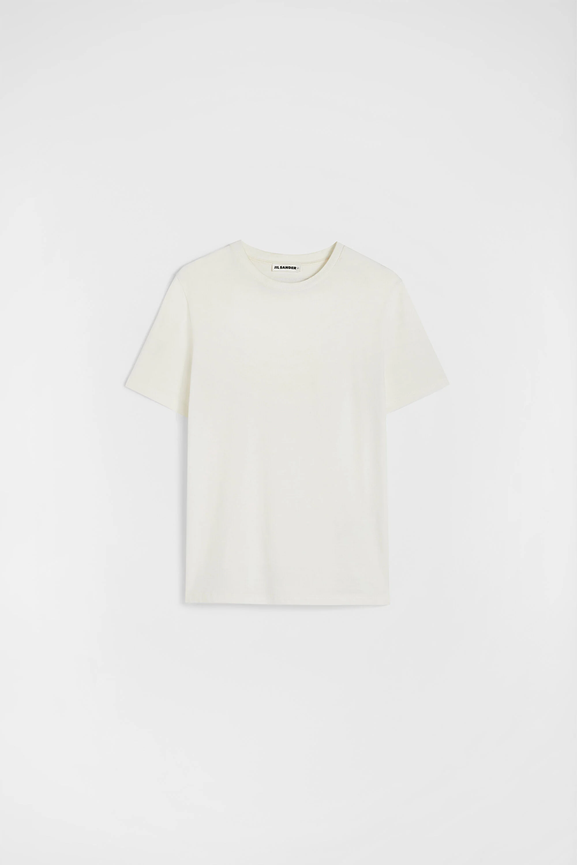 Short-sleeved lightweight cotton jersey t-shirt with back leather patch with embossed Jil Sander+ logo Details - oversized fit - dropped shoulders - Jil Sander+ logo embossed on back leather patch - lightweight compact cotton jersey - 100% cotton - made in Italy - StyleID: J40GC0142J20103102 Care - hand wash - iron with care Fit - model is 177cm/5'9" and is wearing a size S - Please note that the physical label of the item will show the international size