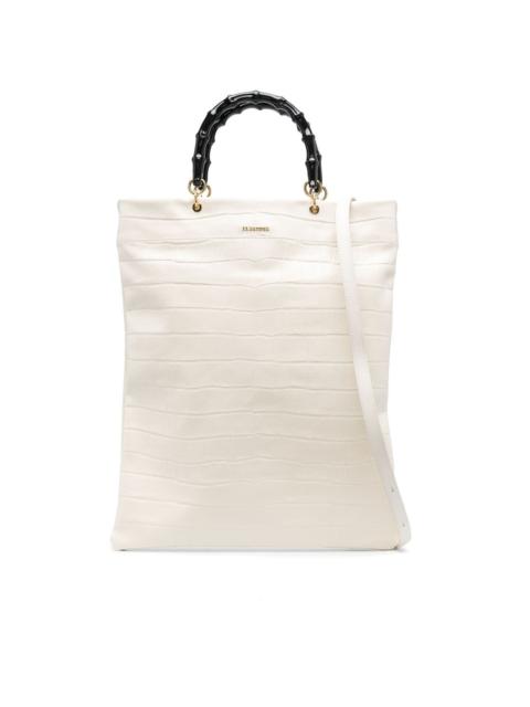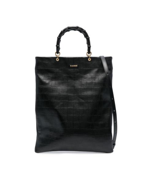 crocodile-effect leather tote Equal parts contemporary and timeless, this tote bag highlights Jil Sander's penchant for minimalist design. Crafted from calf leather, this design is punctuated with an embossed crocodile outer and structured bamboo top handles. Made in Italy Composition Outer: Calf Leather 100% SIZE & FIT Model measurements Height 5 ft 10 in(1.77 m) Bust/Chest 30.7 in(78 cm) Hips 35.43 in(90 cm) Waist 23.62 in(60 cm) Measurement DEPTH 0.39 in(1 cm) HANDLE 4.72 in(12 cm) HEIGHT 16.14 in(41 cm) STRAP 19.29 in(49 cm) WIDTH 13.38 in(34 cm)