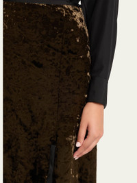 Jil Sander skirt finished in a crushed velvet with contrast-trimmed side slits High waist Knee length Skirt falls straight from hip to hem Side zip closure Slit Length (inches): 8 Proviscose® rayon/polyester Lining: Proviscose® rayon Dry clean Made in Italy Online Inquiries: BGS21_BA32C| Store Inquiries: #5022523
