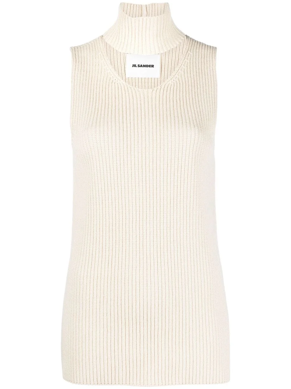 cut-out knitted sweater vest Spun from cotton blend to a ribbed-knit construction, this beige sweater vest speaks to Jil Sander’s penchant for minimalism with a twist. It’s punctuated by a curved cut-out at the neck. Highlights - Light beige - Cotton blend - Ribbed knit - Cut-out detailing - High neck - Sleeveless Made in Italy Composition Cotton 58%, Polyester 42% SIZE & FIT Model measurements Height 5 ft 10 in(1.78 m) Bust/Chest 30.7 in(78 cm) Hips 34.64 in(88 cm) Waist 23.22 in(59 cm) FittingInformation Designed for a relaxed fit, this piece allows for comfort and movement when worn Made with a midweight knit, this piece offers some stretch This piece fits true to size – take your usual size Washing instructions Dry Clean Only