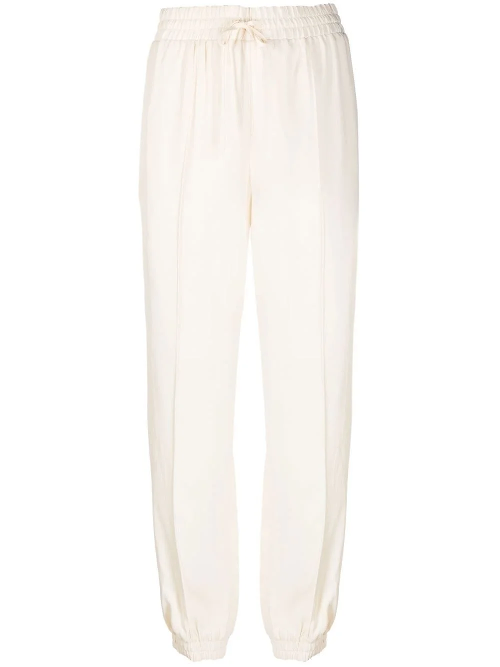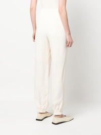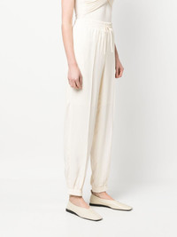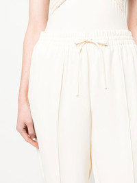 drawstring tapered trousers ivory white elasticated drawstring waistband flared design two side slit pockets elasticated ankles Made in Italy Composition Lining: Viscose 95%, Spandex/Elastane 5% Outer: Viscose 100% SIZE & FIT Model measurements Height 5 ft 10 in(1.78 m) Bust/Chest 31.49 in(80 cm) Hips 36.22 in(92 cm) Waist 25.59 in(65 cm) FittingInformation Designed for a tapered fit, these trousers allow for a close fit at the waist and a loose unrestricted fit over the leg with a closer fit towards the ankle The elasticated hem at the ankle allows for movement and a comfortable fit Made from a midweight non-stretch fabric This piece fits true to size – take your usual size Washing instructions Dry Clean Only
