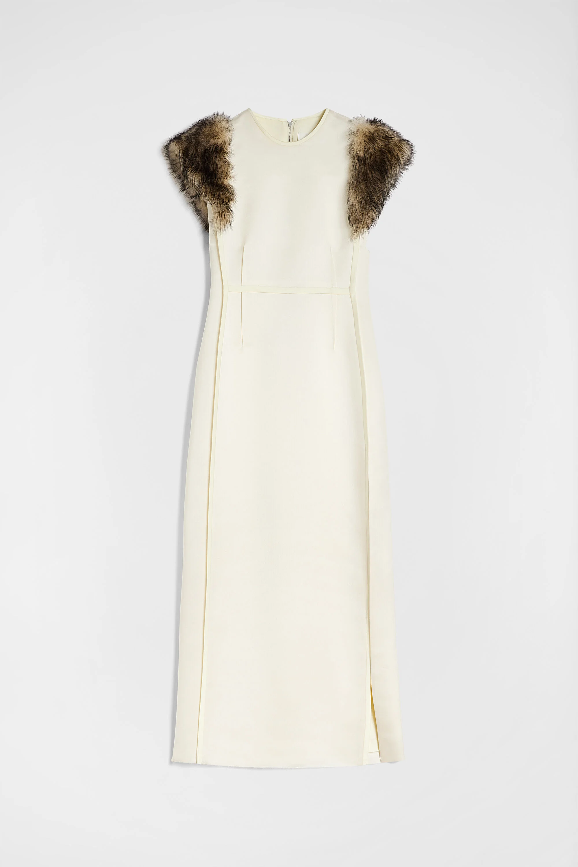 Long silk duchess dress with short shearling sleeves and side slit Details - long length and fitted - centre-back zip closure - 3D seam detail - left side slit - frayed hem - viscose lining - silk and polyester blend duchess - 70% polyester 30% silk, collar 100% lamb fur - made in Italy - StyleID: J03CT0537J55099108 Care - dry clean only - iron with care Fit - model is 177cm/5'9" and is wearing a size 34 DE - Please note that the physical label of the item will show the German size