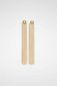 Handcrafted brass hoop earrings with fabric fringes and engraved Jil Sander logo Details - gold toned - ivory toned fringes - snap post closure - engraved Jil Sander logo - nickel tested - antioxidant treatment - 100% brass - made in Italy - StyleID: 8058191483890