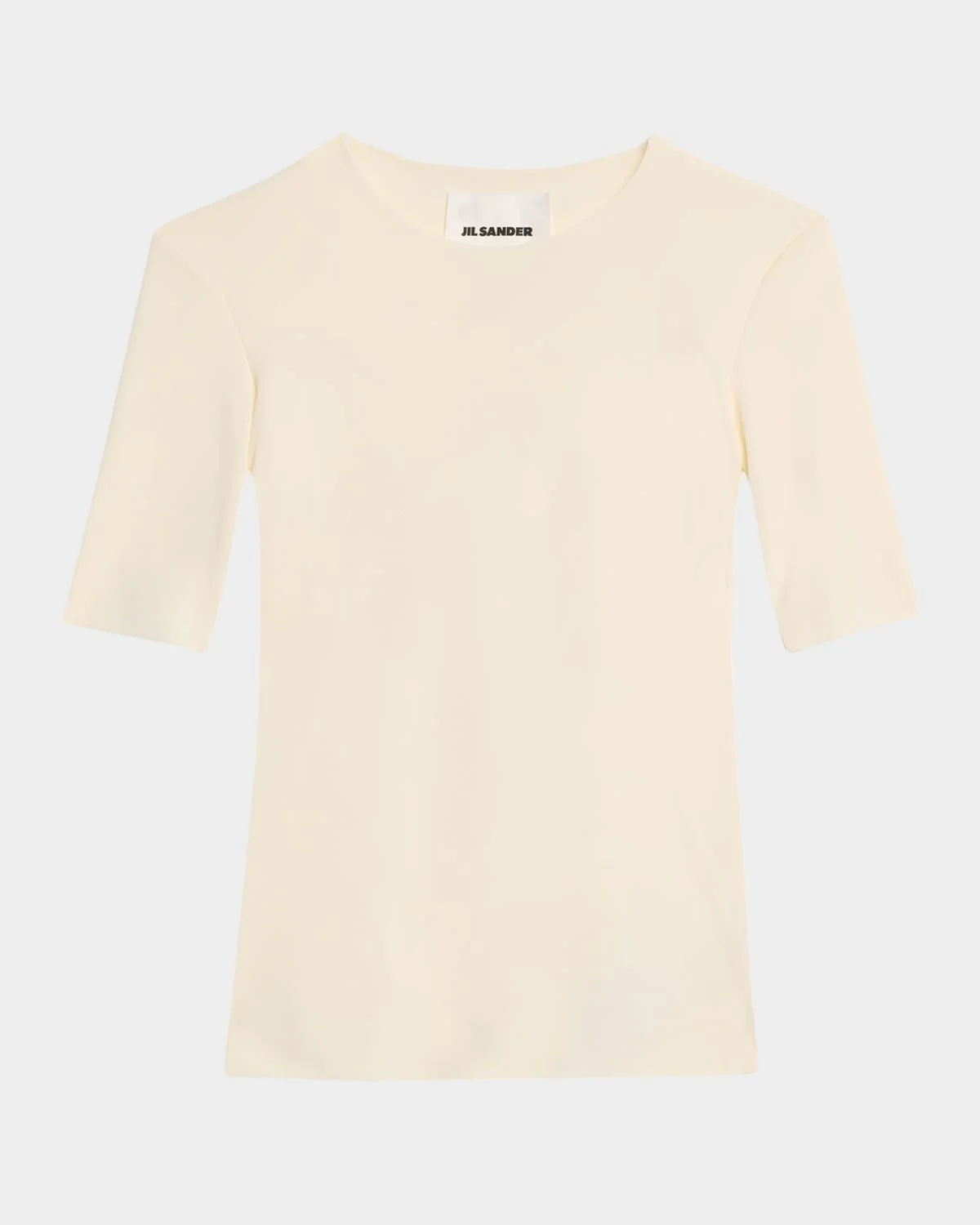 Jil Sander top Crew neckline Elbow sleeves Slim fit Pullover style Viscose/nylon/polyamide Made in Italy Model is 5'10"/177cm.