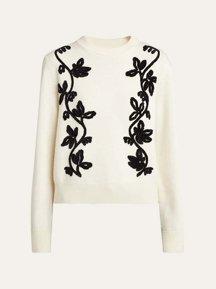 Velvet Floral Embroidered Merino Crewneck Sweater