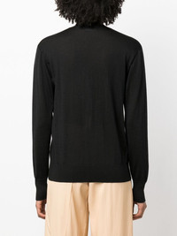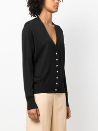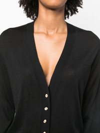 fine-knit V-neck cardigan Highlights - Black - Virgin wool-cashmere-silk blend - Fine knit - V-neck - Front button fastening - Long sleeves - Ribbed cuffs and hem - Straight hem Made in Italy Composition Cashmere 35%, Virgin Wool 35%, Silk 30% SIZE & FIT Model measurements Height 5 ft 10 in(1.77 m) Bust/Chest 33.07 in(84 cm) Hips 37 in(94 cm) Waist 24.8 in(63 cm) FittingInformation Designed for a relaxed fit, this piece allows for comfort and movement when worn Made with a lightweight knit, this piece offers some stretch This piece fits true to size – take your usual size Washing instructions Dry Clean Only