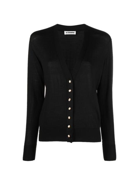 fine-knit V-neck cardigan pastel yellow virgin wool-cashmere blend fine knit V-neck front button fastening ribbed cuffs and hem long sleeves straight hem Made in Italy Composition Cashmere 35%, Virgin Wool 35%, Silk 30% SIZE & FIT Model measurements Height 5 ft 10 in(1.78 m) Bust/Chest 33.07 in(84 cm) Hips 36.61 in(93 cm) Waist 24.8 in(63 cm) FittingInformation Designed for a relaxed fit, this piece allows for comfort and movement when worn Made with a lightweight knit, this piece offers some stretch This piece fits true to size – take your usual size Washing instructions Dry Clean Only