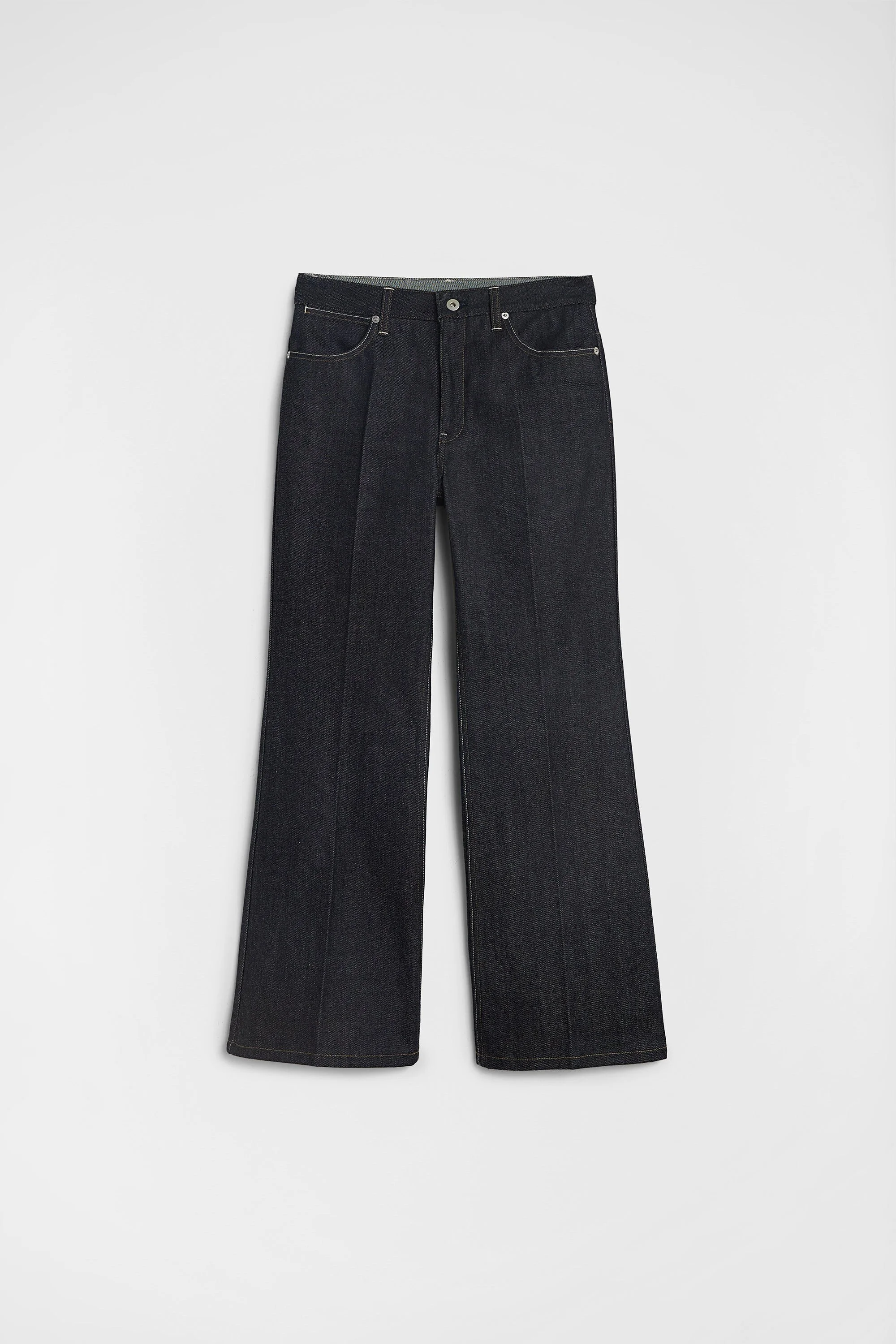 Japanese raw denim trousers with back leather patch with embossed Jil Sander logo Details - relaxed fit - regular crotch and waist - flared cropped leg - zip fly and button closure - five pockets - back leather patch with embossed Jil Sander logo - Japanese raw denim - 100% cotton - made in Japan - StyleID: J04KA0120J45041405 Care - hand wash - iron with care Fit - model is 177cm/5'9" and is wearing a denim size 27 - Please note that the physical label of the item will show the Denim sizing