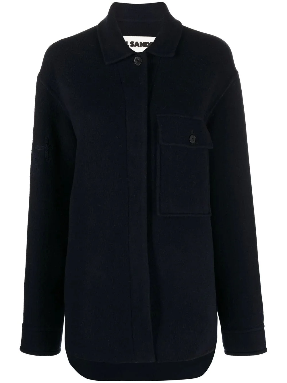 flocked-monogram wool jacket Inspired by classic workwear, this Jil Sander jacket is cut from wool for an overshirt silhouette. It has a brushed finish for added warmth, and the label's signature clean minimalist silhouette. Made in Italy Composition Lining: Cotton 100% Outer: Wool 100% SIZE & FIT Model measurements Height 5 ft 10 in(1.77 m) Bust/Chest 31.49 in(80 cm) Hips 33.85 in(86 cm) Waist 22.44 in(57 cm) FittingInformation This piece fits true to size. We recommend you get your regular size Cut for a loose fit Made with a mid-weight non-stretch fabric Washing instructions Dry Clean Only