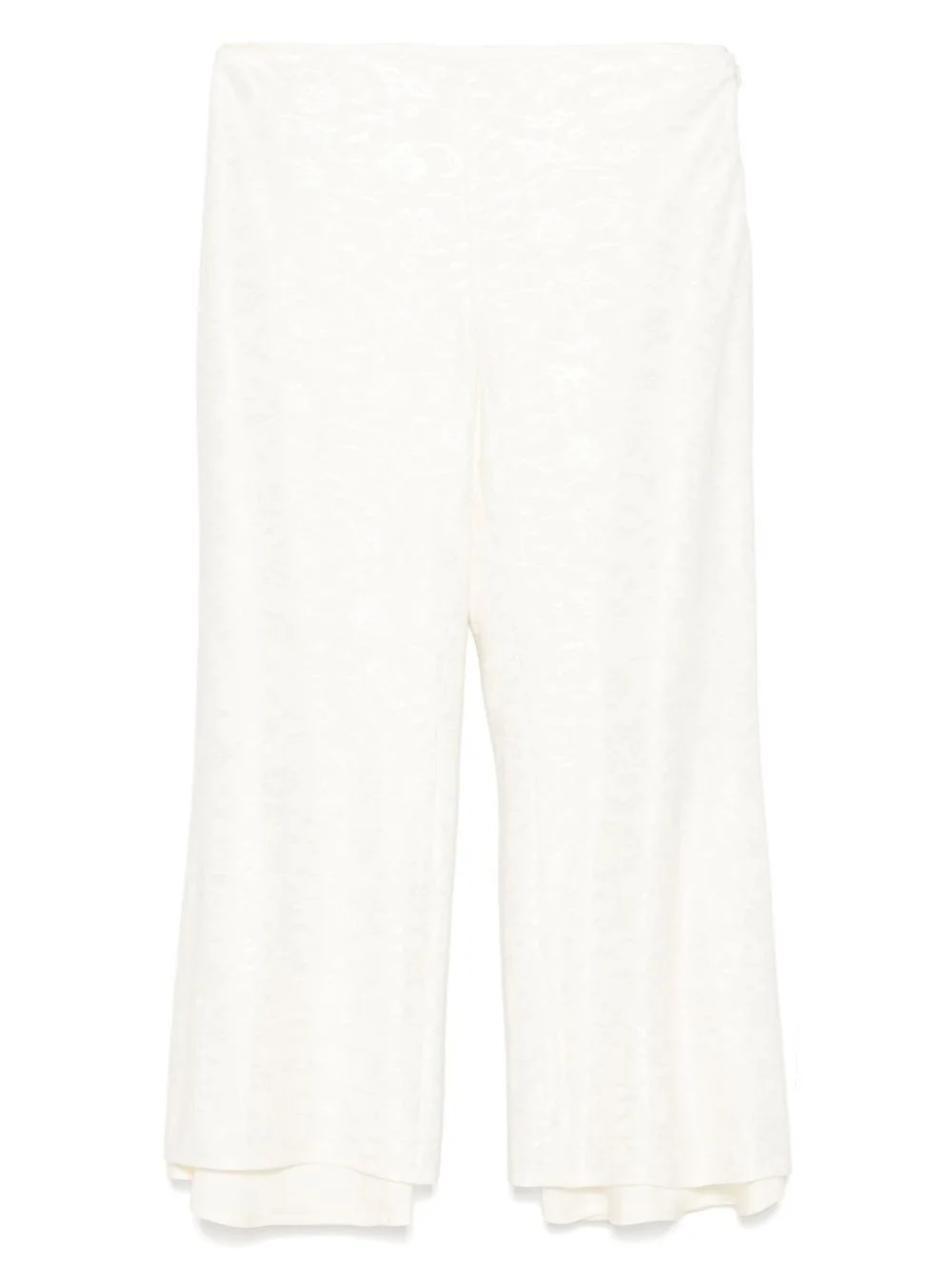 flower-jacquard trousers Highlights - White - Concealed side hook and zip fastening - Full lining - Cropped leg Made in Italy Composition Outer: Viscose 96%, Elastane 4% Lining: Viscose 100% SIZE & FIT Model measurements Height 5 ft 10 in(1.78 m) Bust/Chest 33.46 in(85 cm) Hips 36.22 in(92 cm) Waist 23.22 in(59 cm) FittingInformation Designed with a flared hem, these trousers allow for a close fit at the waist with a slim fit over the leg and widening towards the hem Made from a lightweight fabric Washing instructions Dry Clean Only