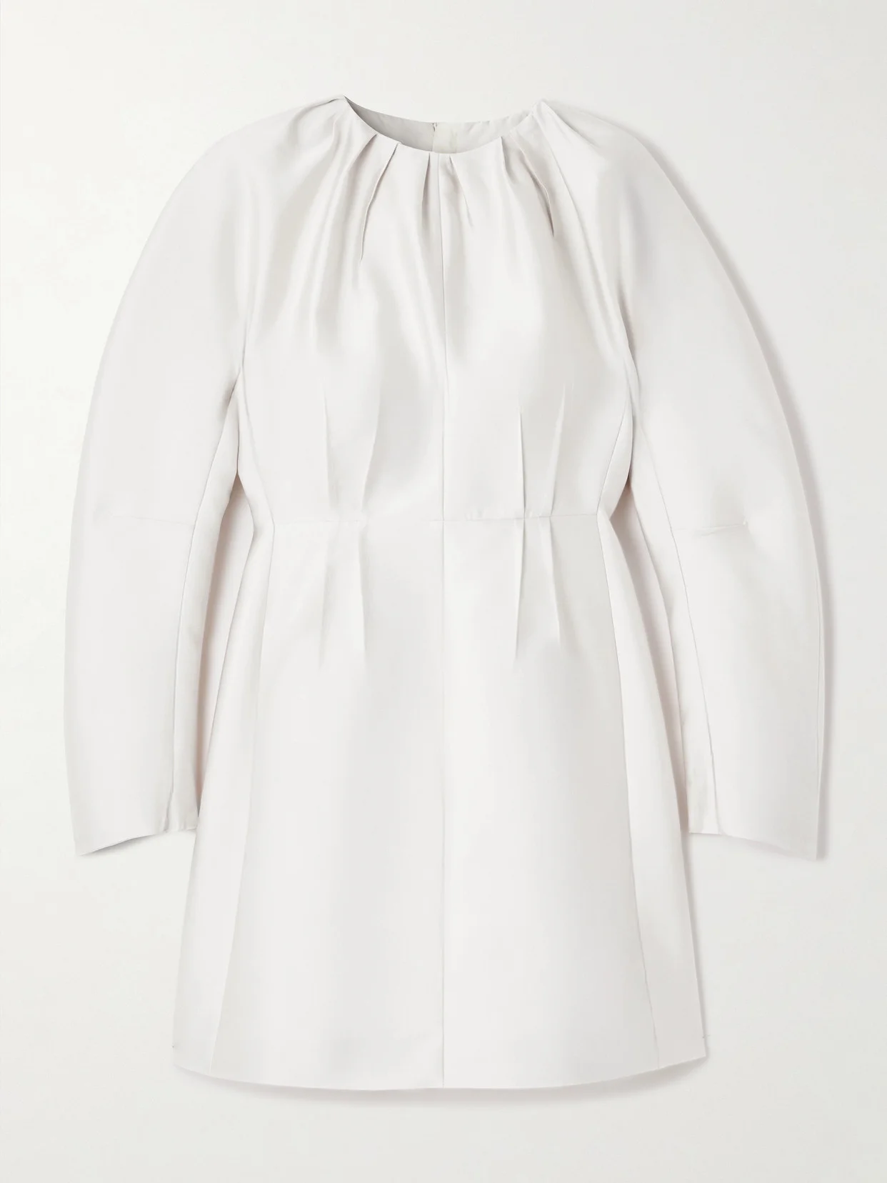 Raw cuts and sculptural silhouettes define Jil Sander's Fall '25 collection. This dress is made from lustrous satin-twill that's neatly pleated along the high neckline and nipped-in waist. Rounded sleeves enhance the shape.