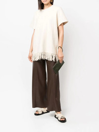 fringe-detail knitted top beige cotton-blend fringe detailing knitted construction round neck short sleeves Made in Italy Composition Cotton 53%, Linen/Flax 44%, Polyamide 2%, Polyurethane 1% SIZE & FIT Model measurements Height 5 ft 11 in(1.8 m) Bust/Chest 33.07 in(84 cm) Hips 37.4 in(95 cm) Waist 25.19 in(64 cm) FittingInformation This piece fits true to size. We recommend you get your regular size Cut for a loose fit Made with a mid-weight fabric Washing instructions Dry Clean Only