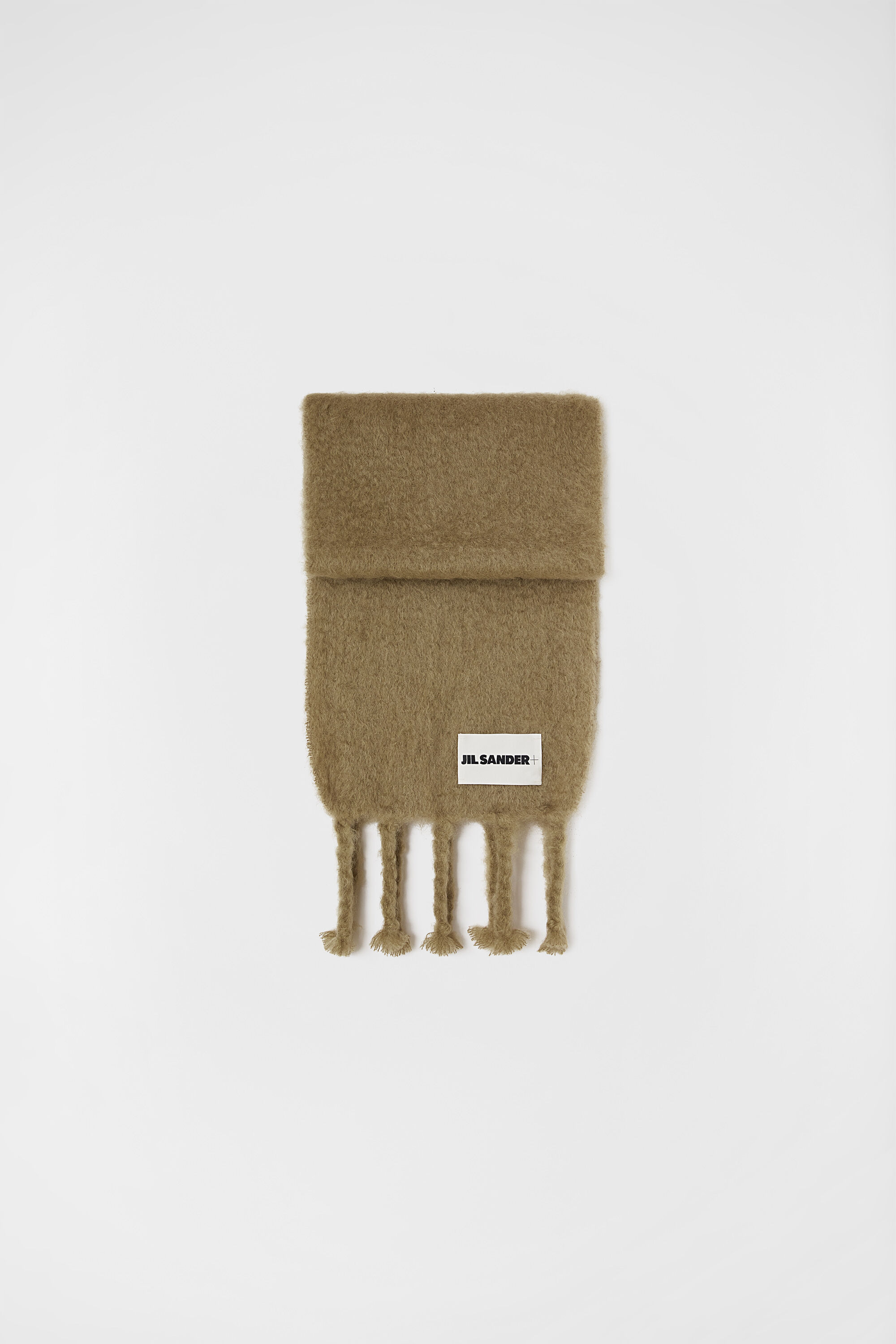 Long handknit wool and mohair scarf with Jil Sander+ logo label Details - fringed hem detail - Jil Sander+ logo label stitched at bottom - 73% mohair 24% wool 3% polyamide-nylon - made in Spain - StyleID: J40TE0118J40041289 Care - dry clean only - iron with care