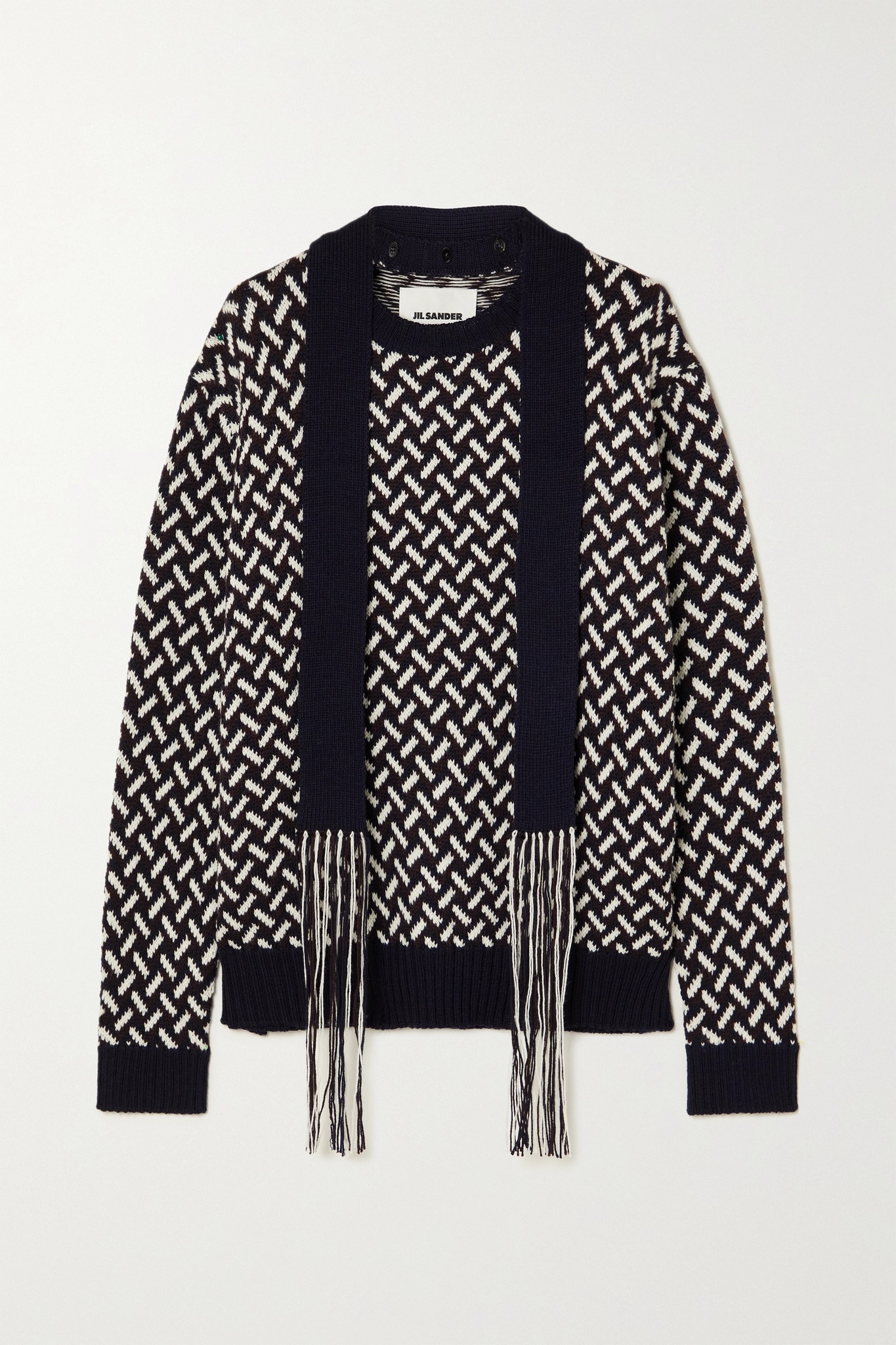 Fringed tie-neck intarsia wool sweater