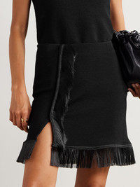 Jil Sander often focuses on texture and shape when designing. This mini skirt is cut from crepe in an A-line profile and detailed with lustrous fringing along the hem and a wrap-effect front. Wear yours with a black top or sweater. Size & Fit - Fits true to size, take your normal size - Mini-length, designed to be worn at the waist - Mid-weight knit with fringed trim - Model is 177cm/ 5'10" and is wearing a DK 34 Model measurements: - Bust: 85cm/ 33.5" - Waist: 65cm/ 25.5" - Hip: 91cm/ 36" Details & Care - Black crepe - Concealed hook and zip fastening at side - 62% viscose, 37% polyamide, 1% elastane; trim: 100% polyester - Unlined - Dry clean