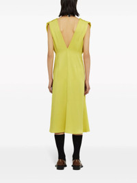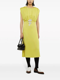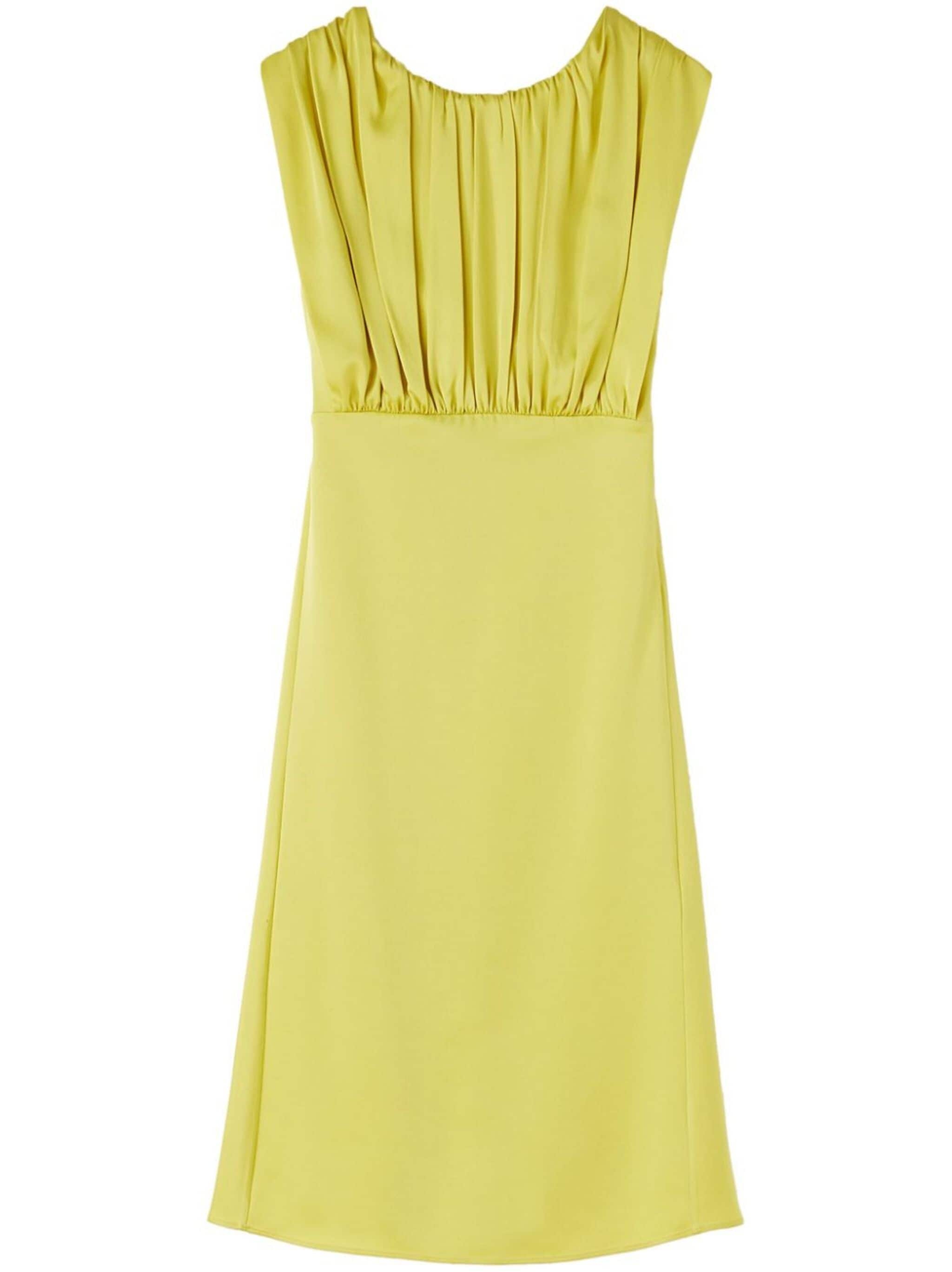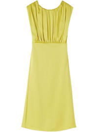 lime green satin weave gathered detailing round neck concealed side zip fastening sleeveless V-back straight hem mid-length Size & Fit Model Measurements: Bust: 0cm Height: 0cm Hips: 0cm Waist: 0cm HIPS: 94cm Length: 116cm WAIST: 68cm Fabric and Care Designer Style ID: J01CT0161J76018 Designer Colour: 341 Composition: Viscose 26%, Acetate 74% Washing instructions: Read Manufacturer Guidelines Made in Italy