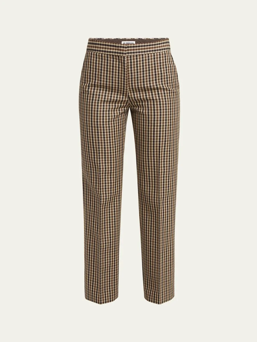 Jil Sander tailored pants in refined gingham Approx. measurements: 10.0" rise; 28" inseam; 38" outseam Cropped fit Mid rise sits high on hip Straight legs Side pockets; back pockets Tab/zip fly Wool Lining: Cotton Dry clean Made in Italy Online Inquiries: BGS21_BA324| Store Inquiries: #5022515