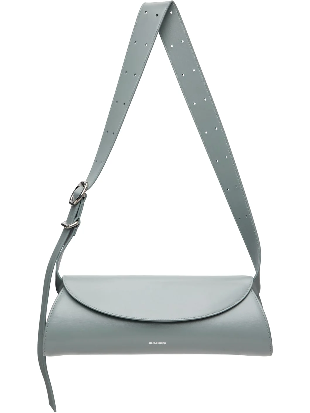Buffed calfskin shoulder bag. · Adjustable shoulder strap · Logo stamp at face · Magnetic press-stud flap · Card slot at interior · Nappa leather lining · H4" x W11.25" x D3.75" Supplier color: Silver Calfskin. Made in Italy 252249F048016