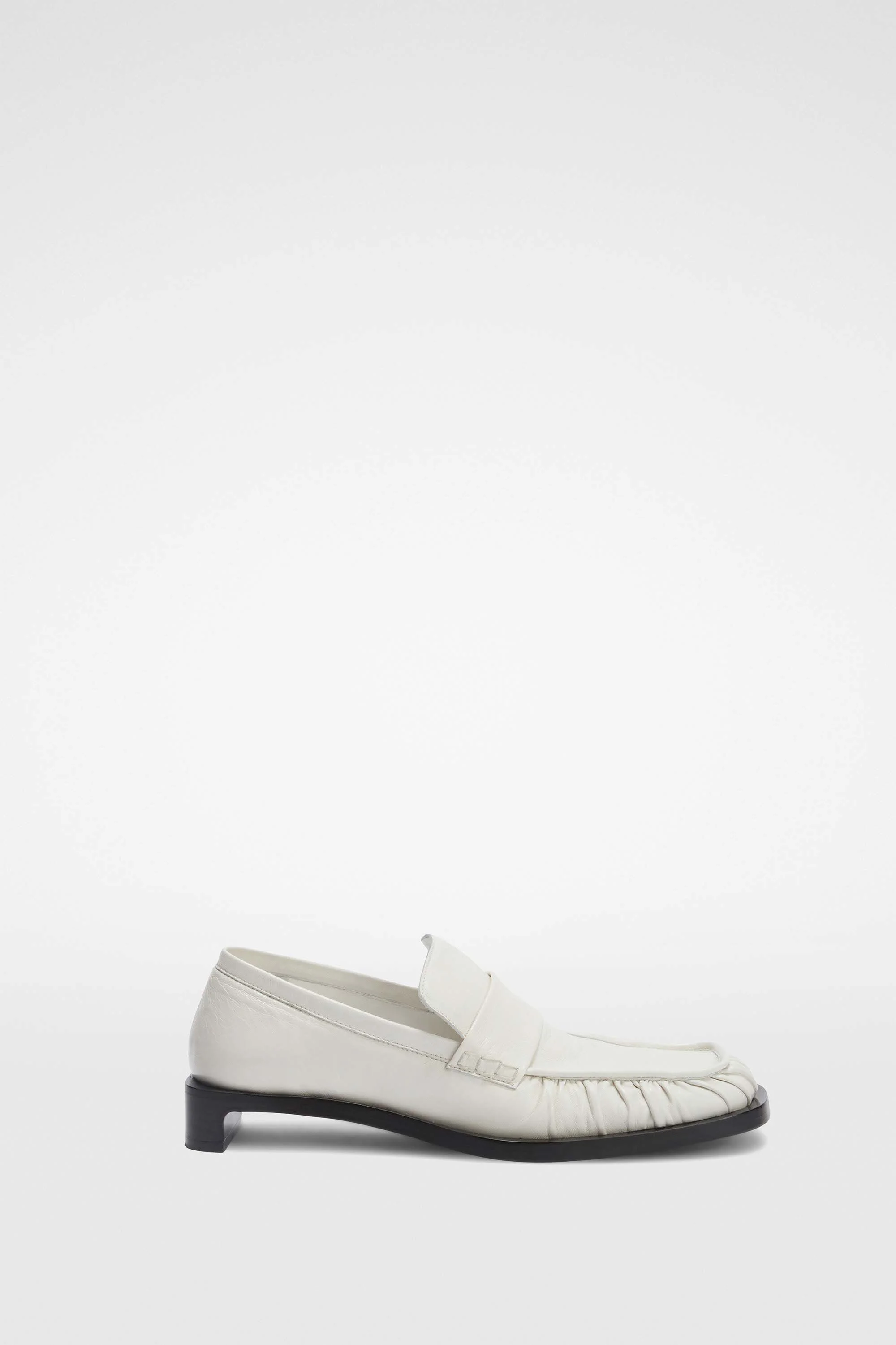 Leather loafer with small heel and hand-stitched wrinkled upper Details - squared deconstructed toe - exaggerated welt - nappa leather insole and lining - calf leather outersole with rubber injection - Jil Sander logo branded insole - 100% ovine leather - made in Italy - StyleID: J16WR0020P4835102