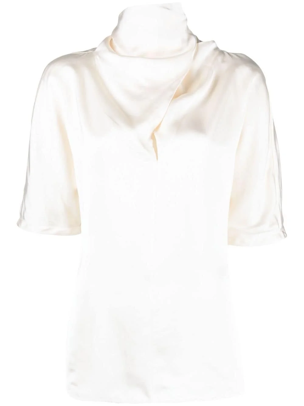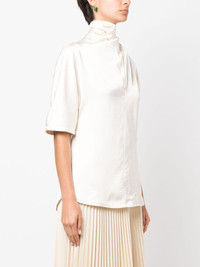 high-neck silk blouse Highlights - Eggshell white - Silk - Gathered neckline - High neck - Rear button fastening - Short sleeves - Straight hem Made in Italy Composition Lining: Silk 100% Outer: Viscose 100% SIZE & FIT Model measurements Height 5 ft 11 in(1.8 m) Bust/Chest 31.49 in(80 cm) Hips 35.43 in(90 cm) Waist 24.4 in(62 cm) FittingInformation Designed for a slim fit that sits just away from the body offering a close yet comfortable fit Constructed with a narrow neckline Made from a midweight non-stretch fabric This piece fits true to size – take your usual size Washing instructions Dry Clean Only