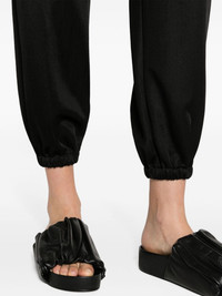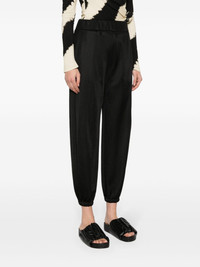high-waist tapered trousers Highlights - Black - High-shine finish - High waist - Elasticated hem - Two side slit pockets - Tapered leg - Elasticated ankles Made in Italy Composition Outer: Viscose 78%, Polyamide 22% Lining: Viscose 100% SIZE & FIT Model measurements Height 5 ft 11 in(1.8 m) Bust/Chest 33.07 in(84 cm) Hips 37 in(94 cm) Waist 25.59 in(65 cm) Measurement FRONT RISE 12.59 in(32 cm) INSIDE LEG 28.34 in(72 cm) HIPS 44.09 in(112 cm) WAIST 30.7 in(78 cm) FittingInformation Designed for a tapered fit, these trousers allow for a close fit at the waist and a loose unrestricted fit over the leg with a closer fit towards the ankle The elasticated hem at the ankle allows for movement and a comfortable fit Made from a midweight non-stretch fabric, this piece offers minimal elasticity when worn This piece fits true to size – take your usual size Washing instructions Dry Clean Only