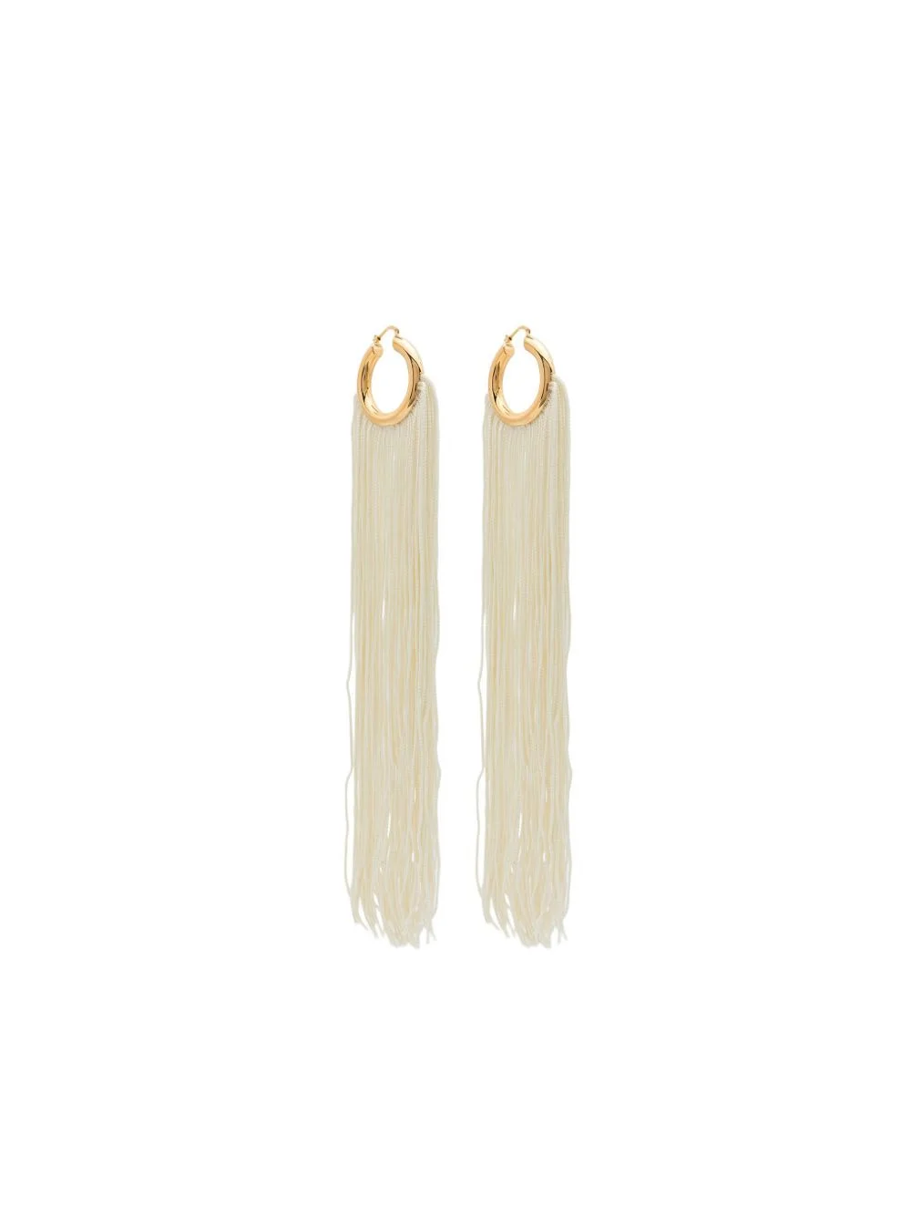 hoops fringe earrings Highlights - Gold-tone and ivory - Gold-tone hoops - Fringe detail - Multiple strands - Long tassels - Hook fastening - These earrings come as a pair. Made in Italy SIZE & FIT Model measurements Height 5 ft 9 in(1.75 m) Bust/Chest 34.64 in(88 cm) Hips 36.61 in(93 cm) Waist 26.37 in(67 cm) Measurement HEIGHT 9.84 in(25 cm) Weight (single earring) 20 g(20 g) WIDTH 0.19 in(0.5 cm)