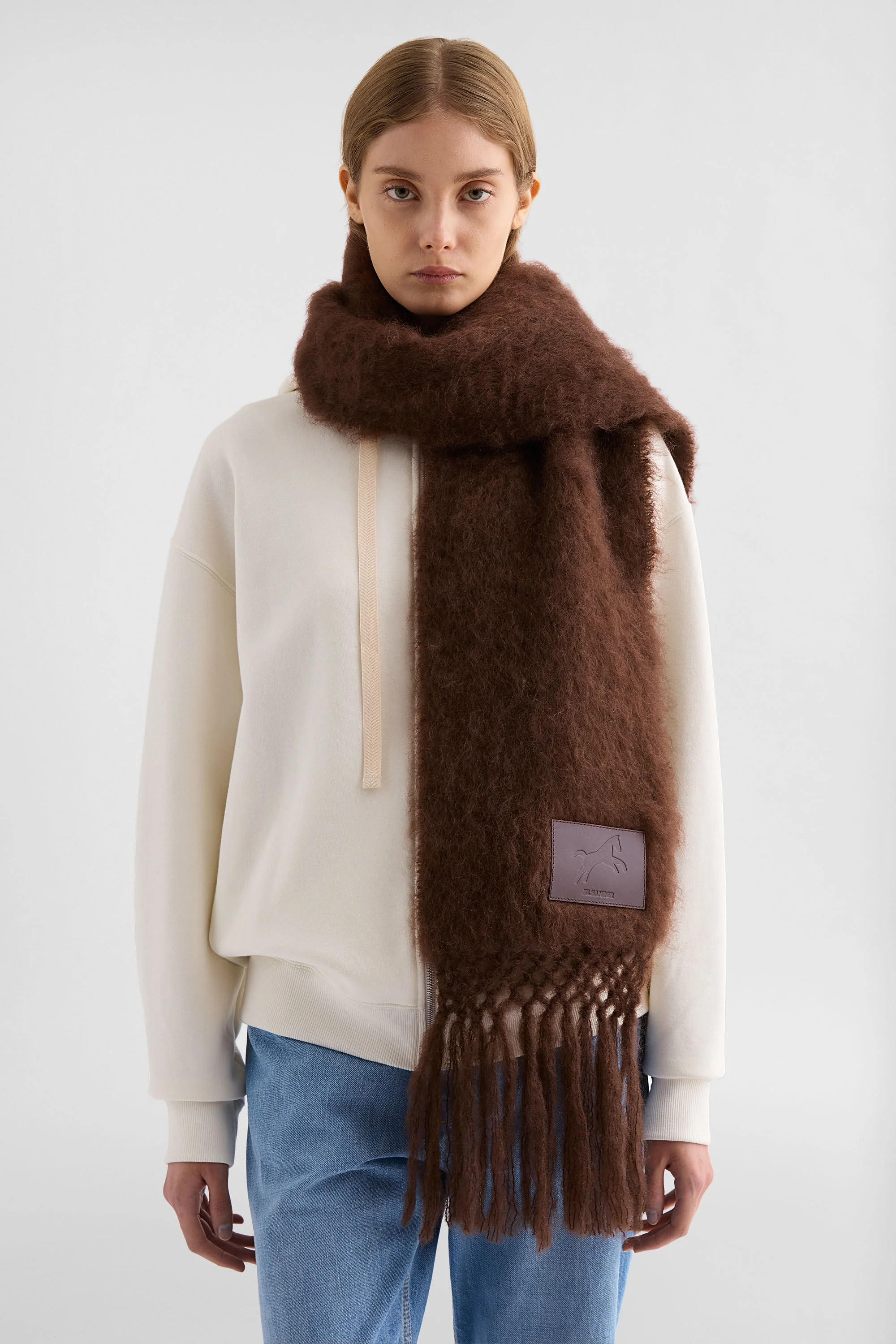 Long hand-knitted wool and mohair scarf with embossed horse symbol and Jil Sander logo Details - fringed hem detail - leather patch with embossed horse symbol and Jil Sander logo - 73% mohair 24% wool 3% polyamide-nylon - made in Italy - StyleID: J53TE0005J40041203