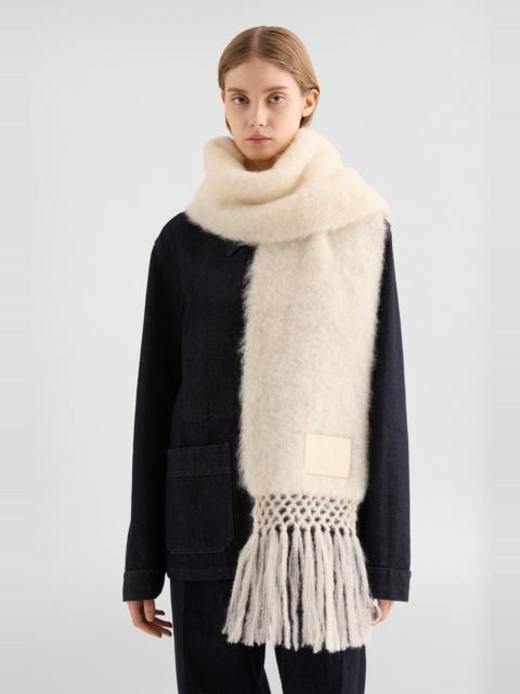 Long hand-knitted wool and mohair scarf with embossed horse symbol and Jil Sander logo Details - fringed hem detail - leather patch with embossed horse symbol and Jil Sander logo - 73% mohair 24% wool 3% polyamide-nylon - made in Italy - StyleID: J53TE0005J40041104