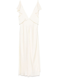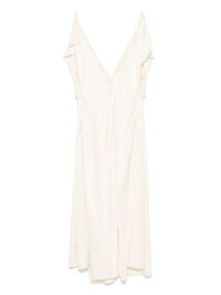 satin midi dress Highlights - White - Concealed side zip fastening - Ruffled detailing - Draped panel detail - Plunging v-neck Made in Italy Composition Viscose 100% SIZE & FIT Measurement HIPS 37.99 in(96.5 cm) LENGTH 49.01 in(124.5 cm) WAIST 27.99 in(71.1 cm) BUST 32 in(81.3 cm)