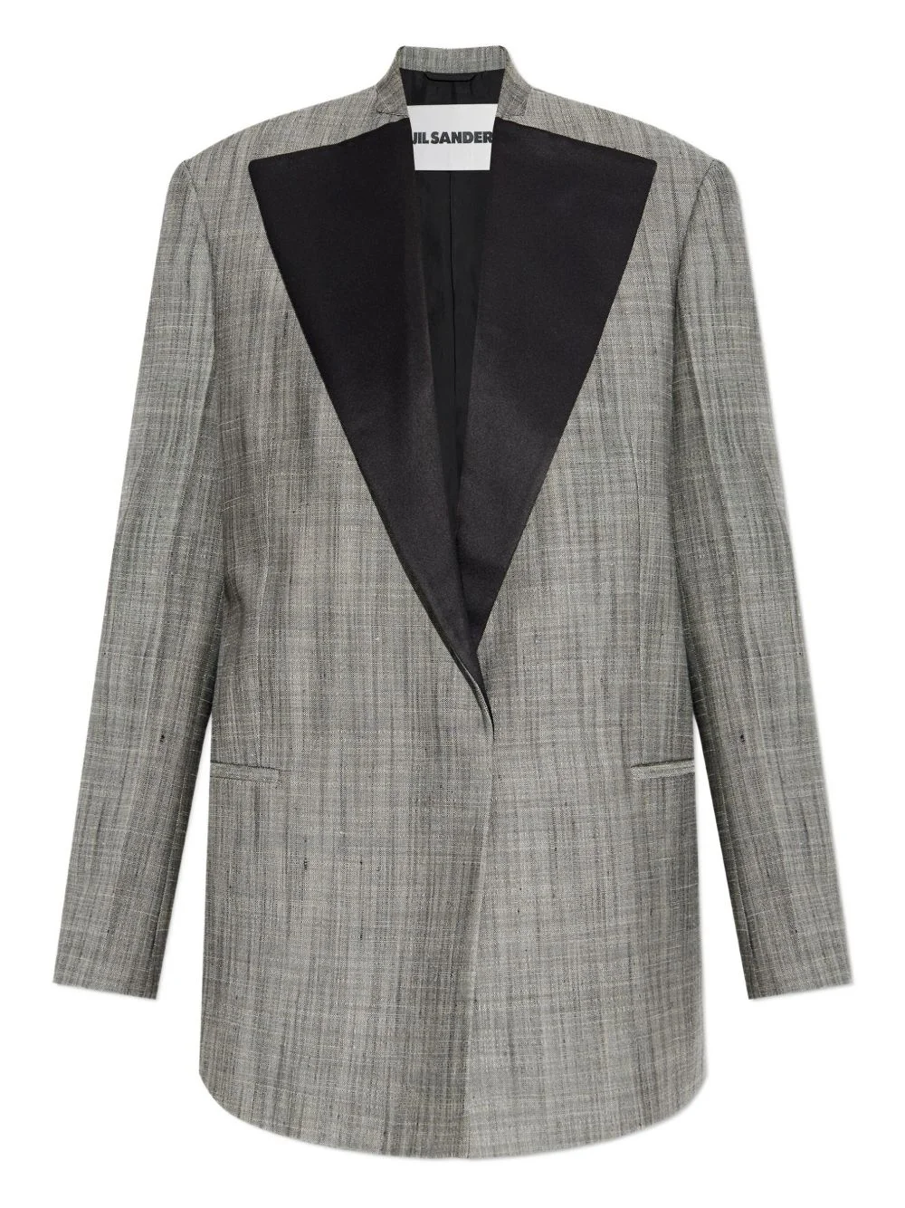 satin-lapel checked jacket Highlights - Grey - Checked pattern - Satin lapel - Single-breasted - Relaxed fit - Long sleeves Made in Italy Composition Silk 42%, Wool 32%, Viscose 14%, Polyester 12% Washing instructions Read Manufacturer Guidelines