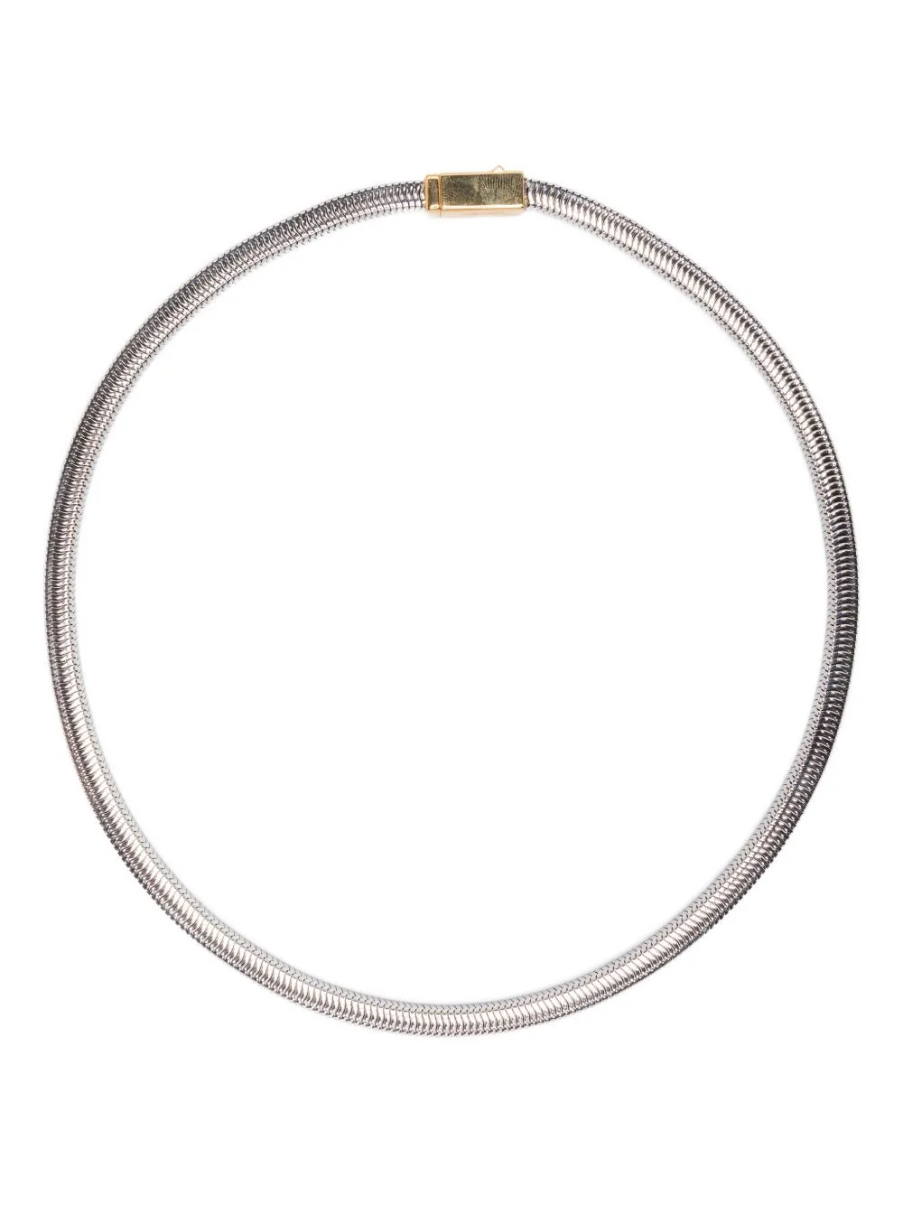 brass necklace Highlights Made in Italy SIZE & FIT Model measurements Height 5 ft 11 in(1.8 m) Bust/Chest 32.67 in(83 cm) Hips 36.22 in(92 cm) Waist 24.4 in(62 cm) Measurement Length when open 21.65 in(55 cm) WIDTH 0.23 in(0.6 cm)