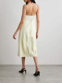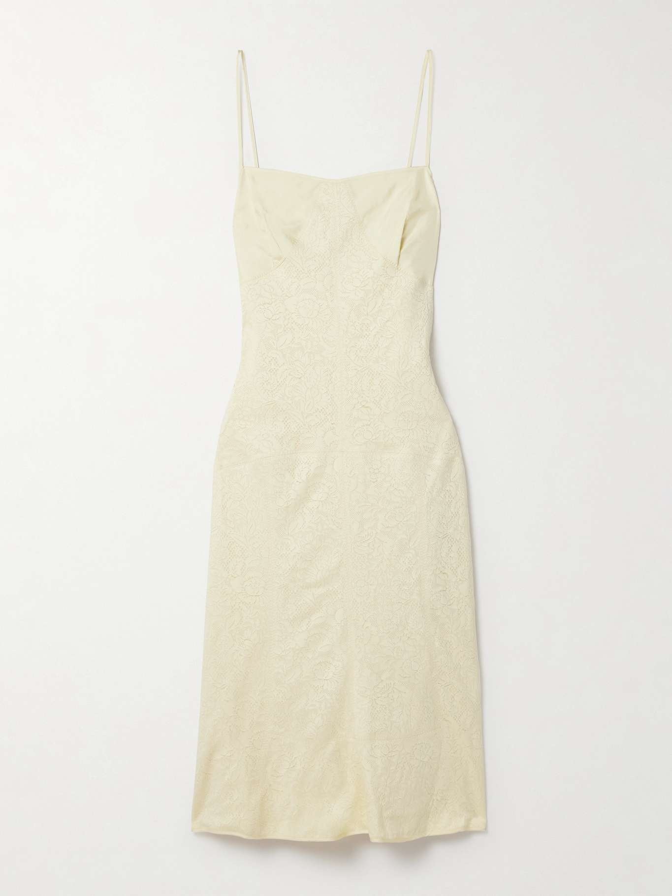 EDITORS'NOTES Jil Sander's midi dress is made from a combination of intricate floral lace and tonal satin that's fully visible at the darted cups. It's designed for a loose fit and has pin-thin straps and a floaty hem. SIZE & FIT Model measurements: - Fits true to size, take your normal size - Designed to be fitted at the bust and waist, loose at the hip - Mid-weight, non-stretchy fabric - Model is 177cm/ 5'10" and is wearing a FR 36 - Bust: 79cm/ 31" - Waist: 61cm/ 24" - Hip: 89cm/ 35" DETAILS & CARE - Cream satin and lace - Hook and concealed zip fastening at side - Fabric1: 43% cotton, 43% viscose, 14% polyamide; fabric2: 100% viscose - Dry clean - Designer color: Pearl