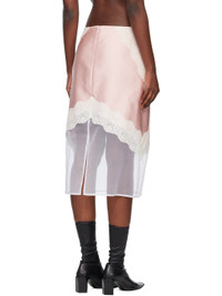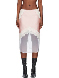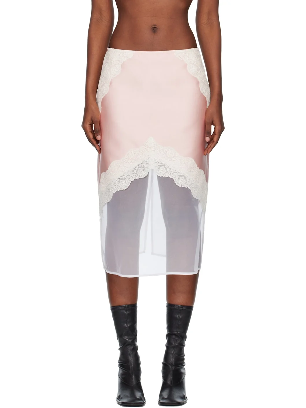 Silk-blend satin and organza midi skirt. · Lace trim throughout · High-rise · Straight-fit · Zip closure at back · Vent at back hem · Partial satin lining Supplier color: Misty blush Body 1: 70% polyester, 30% silk. Body 2: 100% polyester. Trim: 90% cotton, 10% polyamide. Lining: 100% viscose. Made in Italy 252249F092012